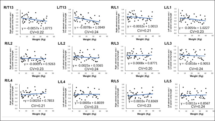 Approximate expressions and CVs are as follows: height of L3 spinal cavity: right y=−0.0018 x + 0.95 and 0.22, respectively, and left y=−0.0033 x + 0.93 and 0.24, respectively, and height of L4 spinal cavity: right y=−0.0004 x + 0.88 and 0.22, respectively, and left y=−0.0019 x + 0.86 and 0.24, respectively (y: adrenal minor axis [mm], x: body weight [kg]). L4 was selected as the measurement site because the corresponding slopes of approximate expression on both sides were small, and CVs were sufficiently small.