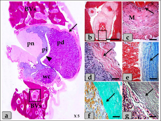 Fig. 1. (a) A panoramic view (sagittal section) of the sheep pituitary gland showing the gland capsule (arrow), pd, pi, pi WC, pn, hypophyseal cleft (arrowhead) and BVs. (b&c) Higher magnifications of the (a) show numerous medium-sized arteries with a thick muscular wall (M) and well-developed undulating internal elastic lamina (arrow). (d) showing the fibrous capsule that rich with fibroblast cells (arrow). (e&f) showing the collagen fibers of the capsule (arrow). (g) showing the reticular fibers of the capsule (arrow). Stain: (a–d) H&E, (e) Blue Masson’s trichrome, (f) OFG, & (g) Gomori’s reticulin. Scale bars: b=300 µm & c–g=40 µm. (The magnification power of (a) is ×5 under SK W/5× Correct microscope). In front of the cone, the pd was the largest part of the whole gland, wing-shaped, forming the main bulk of the adenohypophysis and surrounding the pi except the top of the gland. It was covered with a relatively thick fibrous connective tissue capsule (Fig. 1d) that is mainly formed from collagen (Fig. 1e and f) & reticular fibers (Fig. 1g) and rich with fibroblast cells (Fig. 1d) The pd is considered the glandular epithelial portion of the pituitary gland as its parenchyma consists mainly of different glandular epithelial cells that are arranged in clusters, nests (Fig. 2a–e), and sometimes irregular branching cords (Fig. 1f). These glandular cells were supported and laterally separated from each other’s by a thin loose connective tissue septa; mainly collagen (Fig. 2d) & delicate reticular fibers (Fig. 4c) and rich with many sinusoidal blood capillaries (Fig. 3c) to support & supply the gland, in addition, to conduct the secretory material, hormones out of the gland. According to the H&E and special stains affinities of the secretory material within the cells, the pd revealed three different cell types; chromophobe cells (CC), acidophil cells (AC) & BC. CC were small-sized, rounded, or polygonal shaped and arranged in clusters. With H&E and special stains, their cytoplasm was devoid of any secretory granules, so it appeared lighter or colorless, which was considered the most characteristic feature of these cells. Their nuclei were oval or rounded with a larger N/C ratio (Nucleus/ Cell ratio) and were centrally located with distinct nucleolus (Fig. 2a–c). They are a reserve population of cells (stem-like cells) from which any of the various fully granulated cells can be formed, so they are considered the inactive form of chromophil cells. AC were larger than the chromophobes; most were located in the central and lateral parts of pd. They were round or ovoid-shaped, sometimes triangles, and had medium-sized in between chromophobes and basophils. Their nuclei were large, vesicular, rounded, or oval, centrally located with distinct nucleolus (Fig. 2a–d). Its cytoplasm was voluminous and contained large-sized granules that were acidophilic with H&E (Fig. 2a and b), red with Masson’s trichrome (Fig. 2c and d), and orange with orange G (Figs. 2e and f & 3a and b) and so, were described as orangeophils but negative with PAS reaction (as, no carbohydrates). With special stains like Br-Ab- OFG, the acidophils could be distinguished into two types; Somatotrophic and Lactotrophic cells (LC). Somatotrophic cells (SC) were the most common cell type in the pd. They were distributed either singly or commonly in clusters throughout the pd. Their shape varied from rounded, ovoid, or polygonal. Their nuclei were vesicular, rounded or oval shaped, and centrally located with the distinct nucleolus. Its cytoplasm appeared granulated and had numerous large, spherical secretory granules that stained acidophilic with H&E (Fig. 2a and b), red with Masson’s trichrome (Fig. 2c and d), and orange with orange G (Figs. 2e and f & 3a and b) but failed to stain with PAS. LC, Mammotrophic cells, were typically similar to SC in shape and staining affinity but relatively more minor in size and were arranged in clusters mainly but could be found scattered individually within the pd (Fig. 2). BC were relatively few than acidophils but larger in size. They were more concentrated in the central portion of the pd. According to the reactivity of BC to Br-AB- OFG, they were classified into two main classes; S-cells were basophils whose secretory granules contained Alcian blue demonstrated sulfur-containing amino acid that stained dark green blue and included Adrenocorticotrophs. R-cells were basophils whose secretory granules resist oxidation & Alcian blue but stained magenta red, including thyrotrophs cells and gonadotrophs cells. Basophils were rounded, oval, or polygonal shaped with oval or rounded nuclei. Its cytoplasm had small-sized secretory granules and had a slightly basophilic appearance with H&E (Fig. 2a and b), dark blue with alcian blue stain (Figs. 2e & 3a and b), and magenta or purple with PAS (Fig. 3c and d) because of the high content of glycoprotein, and subsequently, with special dyes, the basophil could be differentiated to three different types; Thyrotrophic cells (TC), Adrenocorticotrophic cells (ACTH) & GC. ACTH were relatively few, smaller-sized than other basophils, and scattered throughout the pd. It varied in shape from elliptical, pyramidal to stellate or polygonal, sometimes, possessed processes that ended on the walls of sinusoids. Their nuclei were round or oval shaped, central position with prominent nucleoli, and with a small N/C ratio. Their cytoplasmic was basophilic and stained dark green-blue after the Br-AB-OFG technique as they were rich with sulfur-containing amino acid (Figs. 2e & 3a and b). TC, unlike other kinds of cells, were more frequently present in clusters or cords, which were localized mainly at the center of pd. They were larger stellate, pyramidal, polygonal, or rounded in shape. The nuclei were oval or rounded with a small N/C ratio. Their cytoplasm was relatively more voluminous and contained excellent cytoplasmic granules that stained magenta red 