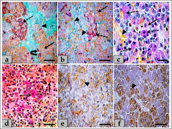 Fig. 3. Illustrative photomicrograph of the pd (a,b) Showing the acidophils or orangeophils (arrow), basophils; adrenocorticotrophs (arrowhead), thyrotrophs (dashed arrow), gonadotrophs (curved arrow). (c,d) Showing the orangeophils (arrow) and basophils (dashed arrow). (e,f) showing positive immunohistochemical reactivity of gonadotrophs against anti-FSH antibody (e) and anti-LH antibody (f). Stain: (a,b) Br-Ab- OFG, (c,d) PAS-orange G, (e,f) immunohistochemical stain against anti-FSH antibody and anti-LH antibody, respectively. Scale bars: a,b,d–f=40 µm & c=20 µm. WC (Cephalic cone of pi) or tongue plate of pi A sagittal section through the anterior part of the pituitary gland of an adult male sheep revealed a cone of glandular epithelial cells protruding from the pi towards the lumen of the hypophyseal cleft in the neighborhood of the pd. This cone looked like a tongue plate of pi or bulb-shaped structure (Figs. 1a & 6a). While in the caudal part of the pituitary gland, the hypophyseal cleft intervenes between the pi and the pd without the glandular cone of pi. WC was elongated and observed free along most of its length. But, posteriorly, the WC was continuous with the posterior region of the pi without any line of demarcations (Fig. 6a). This cone was covered externally with lining epithelium of simple cuboidal to stratified epithelium on the side of the hypophyseal cleft (Fig. 6a–c). Meanwhile, its free border was supported externally by the connective tissue capsule of the pituitary gland (Fig. 6a). By using H&E and specific stains like “Br- Ab- OFG,” Masson’s trichrome, and the PAS-orange G technique, the arrangement and histochemical appearance of the glandular epithelial cells forming this cone parenchyma revealed acidophils that filled the majority of the cone intermingled with chromophobes (Fig. 6b and d). Meanwhile, basophils were mainly localized at the most anterior and posterior or caudal part of the cone (Fig. 6a and b). However, a few individually distributed basophils were also observed in the central part between the acidophils (Figs. 6f & 7a and b). All cone glandular epithelial cells were typically similar to the glandular cells of pd but with different distributions and arrangements. There were clusters and sporadically distributed orangeophilic cells that mainly condensed at the central part of the cone; in between them, unstainable cells, chromophobes, and individual basophils were present (Fig. 6f). Orangeophilic cells, SC & Mammotrophic cells were the most common and predominant cell types in the cone. They were typically similar to each other in structure and staining affinity, but the mammotrophs were relatively smaller in size than the somatotrophs, and their cytoplasmic granules were smaller and relatively coarser. They were distributed either singly or commonly in clusters throughout the cone, especially the central part. They were varied from rounded, oval, or polygonal shaped with single, central, vesicular, round, or oval nuclei with distinct nucleolus. Its cytoplasm had numerous large, spherical secretory granules stained eosinophilic with H&E (Fig. 6d), red with Masson’s trichrome (Fig. 6e), and orange with Br. Ab- OFG (Figs. 6f & 7a and c) failed to stain with PAS.