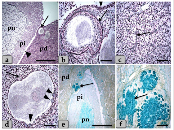 Fig. 4. A sagittal section of the sheep pituitary gland (a) showing the pd, pi, pn, hypophyseal cleft (arrowhead), and follicles of the glandular epithelial cells (arrow). (b) Higher magnification of (a) showing the glandular epithelial cells lining the follicles (arrow) and the covering epithelium of the pd (arrowhead). (c) showing a fine reticular network that entwisted around & supported the parenchymal epithelial cells of pd (arrow). (d) showing the reticular fibers supporting the follicle (arrow) and the glandular epithelial cells lining the follicles intermingled with goblet-like cells (arrowhead). (e,f) showing the colloid-filled cysts in the pd that were filled with strongly alcian blue positive numerous globules with different sizes (arrow). Stain: (a–d) Gomori’s reticulin, (e,f) PFA-AB-PAS-OG. Scale bars: a,e=300 µm & b–d,f=40 µm. Meanwhile, basophils were arranged in clusters in the most anterior & caudal parts of the cone (Figs. 6b and 7c). In addition, sporadic or individual basophils were also recognized in between acidophils (Figs. 6f & 7a and b). They were less numerous but larger in size than the acidophils and chromophobes. They were rounded, ovoid, or polygonal in shape. Their nuclei were oval or rounded in shape and centrally located with the distinct nucleolus. Its cytoplasm had small-sized secretory granules and was stained slightly basophilic appearance with H&E (Fig. 6b), dark green blue after Br-AB-OFG technique; ACTH (Fig. 6f), and magenta red with Br-AB-OFG methods (Figs. 6f & 7a) or magenta or purple with PAS; Thyrotrophs & gonadotrophs (Fig. 7b), because of the high content of glycoprotein. But, to differentiate between them, TC were more frequently present in clusters. They were larger stellate, pyramidal, polygonal, or rounded in shape. The nuclei were oval or rounded with a small N/C ratio. Their cytoplasm was relatively more voluminous and contained very fine cytoplasmic granules. Meanwhile, GC were observed to be variable in size and shape and individually distributed randomly throughout the cone (Fig. 7a). But, with immunohistochemical stains against anti-FSH antibody (Fig. 8a and b) and anti-LH antibody (Fig. 8c and d), gonadotrophs were observed very few and individually distributed within the cone (Fig. 8a–d), but some areas were observed devoid from any positive immune reactions against FSH and LH antibodies (Fig. 8e and f). With high magnification, they were observed to be variable in size from medium to large and oval or angular, or pyramidal in shape. The nuclei were round or oval in shape. Their cytoplasm had a lot of secretory granules with variable sized that gave strongly positive immune reactions (Fig. 8a).