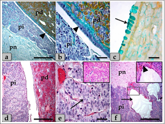 Fig. 5. A sagittal section of the sheep pituitary gland (a) showing the pd, pi, pn, and hypophyseal cleft (arrowhead). (b) showing the covering epithelium of the pd margin facing the pi at the surface of the pituitary cleft (arrowhead). (c) showing the scattered goblet-like cells intermingled between the pd covering epithelial cells (arrow). (d) showing the pd & pi. (e) Higher magnification of the pi showing parallel rows of weakly basophilic glandular cells (arrow). Meanwhile, the inset box shows brightly pink glandular cells; melanotropes with a PFA-AB-PAS-OG stain. (f) showing the colloid-filled cysts in the pi (arrow) with its lining epithelium (arrowhead). Stain: (a,b) Br-Ab- OFG, (c) PFA-AB-PAS-OG, (d–f) H&E. Scale bars: a,d,f=300 µm & b,c,e=40 µm. Resembling the pd, a number of follicles with different sizes and shapes were scattered within the cone, especially at the periphery. They appeared lined with simple cuboidal, to columnar to pseudostratified columnar ciliated epithelium intermingled with large, distinct mucous secreting cells, goblet-like cells that filled with alcian blue positive mucoid substances. Moreover, the follicle lumen was also filled with Ab-positive colloidal mucoid materials forming a structure like colloid-filled cysts (Fig. 7d–f). Behind the cone, the pn was raised as a ventral outpouching of the floor of the brain and retained its connection with the brain by an infundibular stalk. It was observed as water- drop shape, located in the center of the gland and surrounded by the pi & pd. Unlike the cone, pn was observed to be devoid of any glandular secretory or nerve cells (Fig. 9a and b). It consisted mainly of unmyelinated nerve fibers (Fig. 9c and d), herring bodies (corpusculum neurosecretorium) (Fig. 9e), pituicytes (glia cells, supporting cells), blood capillaries (Fig. 9f), and all the previous were supported by reticular fibers. Unmyelinated nerve fibers were the axons of neurosecretory nerve cell bodies located in the supraoptic and paraventricular nuclei of the hypothalamus. These axons direct the downward forming tract and the hypothalamo-hypophyseal tract transporting the neurosecretory materials. They were oriented in many different directions. They ended with highly branching terminal ends resembling tree roots invaginated at the periphery of pn, forming a palisade zone (Fig. 9c and d), and others ended with herring bodies. Herring bodies were dilated terminal ends of unmyelinated nerve fibers with different shapes and sizes. They were considered as the storage swellings of the neurosecretions. The neurosecretory material of herring bodies was stained deep eosinophilic by H&E. Furthermore, with PFA-AB-PAS-OG, they appeared as a blue-violet mass of hyaline material (Fig. 9e).