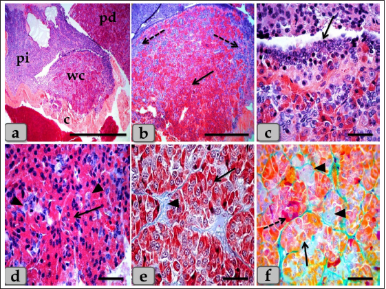 Fig. 6. A photomicrograph of the WC (Cephalic cone of pi), (a) showing the WC, capsule (c), pi, pd. (b) showing the Wulzen’s cone parenchyma; acidophils (arrow) & basophils (dashed arrow). (c) showing the covering epithelium of the WC (arrow). (d) showing the acidophils (arrow) & chromophobes (arrowhead). (e) showing the acidophils (arrow) & intercellular collagen fibers (arrowhead). (f) Showing the acidophils or orangeophils; somatotrophs and mammotrophs (arrow), individual basophils; Adrenocorticotrophs (arrowhead) & thyrotrophs (dashed arrow). Stain: (a–d) H&E, (e) Blue Masson’s trichrome, (f) Br-Ab- OFG. Scale bars: a=400 µm, b=300 µm & c–f=40 µm. Pituicytes were non-secretory supportive neuroglia-like cells with variable shapes and sizes. They are distributed near the blood capillaries between the terminations of nerve fibers. Two types of pituicytes, protoplasmic and fibrous pituicytes (FP), could be distinguished by Br-Ab- OFG and PFA-AB-PAS-OG. Protoplasmic pituicytes (PP) constituted most of the pituicytes. They were elongated oval or ovoid-shaped, larger than fibrous ones, with different protuberances. Their nuclei were long, elliptic, or oval (Fig. 9f). FP, were constituted a handful of pituicytes. They were irregular in shape, smaller in size, with fewer protuberances. Their nuclei were irregularly round or ovoid and stained deep with a larger N/C ratio (Fig. 9f). In some sections, a large wide space or cavity filled with gelatinous material was seen within the center of pn (Fig. 9a and b). This material reacted negatively with both Alcian blue and PAS stains. Furthermore, it appeared as a detached secretory product from the cavity lining cells. The lumen of this cavity was suggested to be connected with the brain ventricle, passing through the infundibulum and lined with simple cuboidal or modified columnar or ependymal-like cells with some basal folds (Fig. 9g–i) that secrete cerebrospinal fluid (CSF). DiscussionThe pituitary gland (hypophysis cerebri) is classified as a main endocrine gland, secreting some hormones which directly affect the vitality of other endocrine organs. It is situated as an appendage of the brain, which refers to its significance as the connection between the nervosa and hormonal mechanisms that control definite functions (Dyce et al., 1987). We described dense plexus of BVs filling the loose connective tissue between the capsule and sphenoid bone. In all the examined sections, this plexus was composed mainly of a rete of medium-sized arteries with well-developed undulating internal elastic lamina and thick muscular walls. Daniel and Prichard (1957) described that the pituitary angioarchitecture remains one of the important aspects of studying the pituitary gland due to the insistent interest in its blood supply and the direction of blood flow. The earliest description of the vasculature of the pituitary gland in sheep showed that it receives its blood supply from two branches on either side. These are the anterior and posterior hypophyseal arteries arising from the internal carotid artery and the carotid rete. These arteries empty in a rich network of BVs surrounding the entire pituitary gland, which shows similarity to humans. Such a network is occasionally known as hypothalamic-pituitary portal circulation or hypothalamo-hypophyseal portal system (Antunes and Muraszko, 1990).