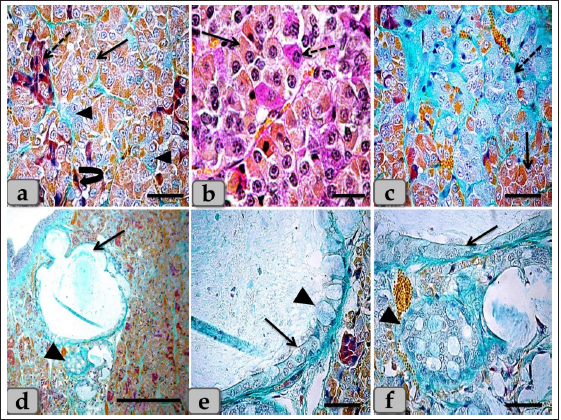 Fig. 7. A photomicrograph of the WC parenchyma (a) showing the acidophils or orangeophils (arrow), basophils; adrenocorticotrophs (arrowhead), thyrotrophs (dashed arrow), gonadotrophs (curved arrow). (b) showing the orangeophils (arrow) and basophils (dashed arrow). (c) showing the orangeophils (arrow), a wide bundle of basophils in the posterior part of the cone (dashed arrow). (d) showing the presence of follicles (arrow) & colloid-filled cysts (arrowhead) with variable sizes in the cone resembling that of pd. (e,f) showing the ciliated glandular epithelial cells lining the follicles (arrow) intermingled with large goblet-like cells that are filled with strongly alcian blue positive materials (arrowhead). Stain: (a,c–f) Br-Ab-OFG, (b) PAS-orange G. Scale bars: a,c,e,f=40 µm, b=20 µm & d=300 µm. Bergland et al. (1977) described that few venous connections were noticed around the hypophyseal gland of sheep and that the adenohypophyseal vascular bed delivers blood (containing adenohypophyseal hormones) to the neurohypophyseal vascular bed, and that these hormones could be delivered to the brain directly after reaching the neurohypophysis. In agreement with Bergland et al. (1977), we did not find venous vessels around the hypophyseal gland. And although not evaluated in the present study, we hypothesize that the hormonal delivery between the adenohypophysis and the hypothalamus to the brain could be through both adenohypophyseal-neurohypophyseal vascular bed (Bergland et al., 1977) and possibly, through the observed cavity, filled with CSF, extending inside the neurohypophysis (seen in the present study, Fig. 9a,b and g). Evidence that this cavity could contribute to the transfer of adenohypophyseal hormones to the brain could be interpreted by earlier findings of diminished plasma LH and FSH after hypothalamo-pituitary disconnection was performed in sheep, as an in vivo model for pituitary isolation that clarified after Clarke et al. (1983). However, future studies are required to confirm this finding. The pd was the most significant part of the gland and was covered with a thin fibrous connective tissue capsule. Its parenchyma consisted mainly of different glandular cells arranged in clusters, nests, and sometimes cords. According to the staining affinities of the secretory granules within the cells, the pd revealed three different cell types; CC, AC, and BC. These findings are very close to those described by Mahmood (2014) in rats and Ye et al. (2018) in Bactrian camels (Camelus bactrianus), and Nasr et al. (2021) in Adult Male Donkey (equas-asinus) Chromophobes were small-sized and polygonal in shape. Its cytoplasm was devoid of any secretory granules, so it appeared lighter or colorless, which was considered the most characteristic feature of these cells. These investigations are in parallelism with those clarified by Jaspal et al. (2011) in camels (Camelus dromedarius) and with Nasr et al. (2021) in Adult Male Donkey (equas-asinus), who clarified that the chromophobes were rounded or polygonal-shaped, negative stained by H&E, their cytoplasm was light blue or colorless, and the nuclei were light blue.