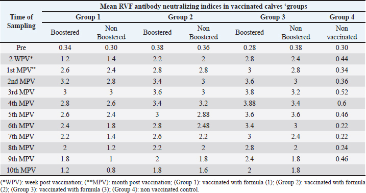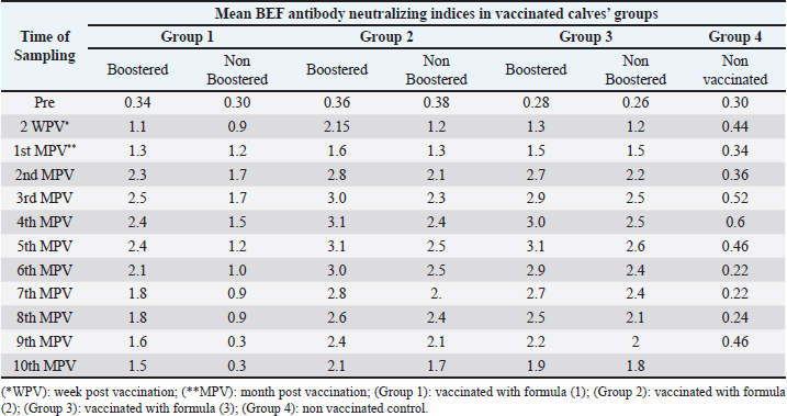 Table 4. Mean BEF antibody neutralizing indices in calves vaccinated with different formula of the prepared freeze-dried combined RVF and BEF vaccine.
