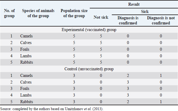 Both vaccines were administered in a therapeutic dose to the species of animals for which they were primarily developed and prescribed, that is, cattle, namely 5–8 month-old calves, which is the most sensitive to exogenous and endogenous changes in age, because in case of success of research of such vaccines on this age category of this species of animals, in the future it would be possible to vaccinate for early prevention of the disease, or its treatment, which is more likely in young organisms, which in turn would give them immunity for their adult future. Table 4. Results of the study of the preventive effectiveness of pentavalent inactivated vaccine against trichophytosis of farm animals.