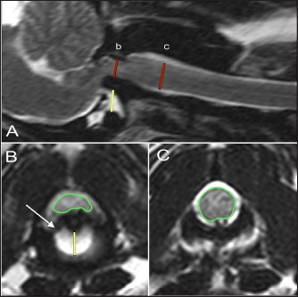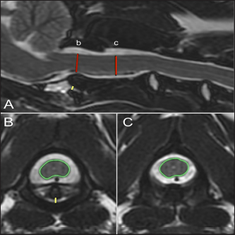 Fig. 2. T2-weighted sagittal (A) and transverse (B, C) images of a 4-year-old spayed female Maltese used as a control dog (TE, 120 ms; TR, 3800 ms; slice thickness, 2.5 mm). On the sagittal image (A), the dorsoventral diameter of the spinal cord at the level of the dens (b) and mid-body of C2 (c) has been measured (red lines), as has the distance from the ventral border of the dens to the caudal articular fovea of the atlas (yellow line). On the transverse images, the cross-sectional area of the spinal cord at the level of the dens (B) and mid-body of C2 (C) has been outlined, as has the subluxation distance from the dens to the atlas (yellow line in B). ResultsClinical findingsForty-two dogs met the selection criteria and were included in the study. All but six patients belonged to the toy group, and Yorkshire terriers made up 47.5% (19/42) of the cases. The breeds represented included: Yorkshire terrier (19/42, 45%), Chihuahua (7/42, 17%), Pomeranian (3/42, 8%), mixed breed (3/42, 8%), and two (5%) each of the following: Maltese, Toy Poodle, Dachshund, Rat terrier, and one (2%) Cavalier King Charles spaniel. The median age was 27 months (range, 3–120 months). The median weight was 2.7 kg (range, 1.1–9.3 kg). There were 23 females (17 spayed and 6 sexually intact) and 19 males (13 neutered and 6 sexually intact). The control population consisted of 26 dogs. The most common breeds were Maltese and Pomeranian, each 18.5% (5/26), with the remaining breeds: Chihuahua (4/26, 15%), Miniature Poodle (3/26, 12%), Yorkshire terrier (3/26, 12%), Miniature Pinscher (2/26, 8%), and 1 each (4%) of Dachshund, Pekingese, Miniature Schnauzer, and Shih Tzu. The median age was 96 months (range, 48–156 months). The median weight was 4.7 kg (range, 2.74–11 kg). There were 13 females, all spayed, and 13 males (1 sexually intact).