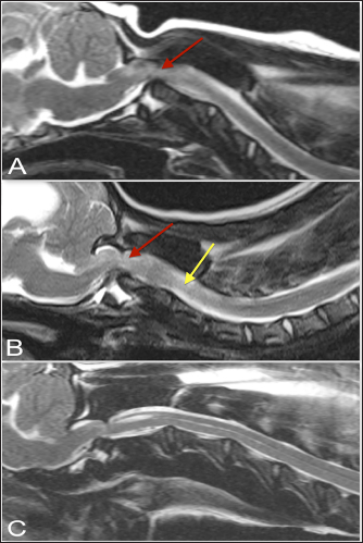 Fig. 4. T-2 weighted sagittal images of three dogs affected by an atlanto-axial subluxation in this study (TE, 120 ms; TR, 3800 ms; slice thickness, 2.5 mm). (A) This dog with atlantoaxial subluxation has intramedullary T2 hyperintensity at the level of compression that likely indicates edema or ischemia (red arrow). Chiari malformation is absent. (B) There is Chiari malformation causing impaction of the cerebellum, with similar intramedullary hyperintensity at the level of compression as in A (red arrow) but additional pre-syrinx formation caudal to the level of spinal cord compression (yellow arrow). This dog was also graded as having moderate hydrocephalus. (C) There is Chiari malformation causing indentation of the cerebellum and focal syringomyelia greater than 2 mm in diameter. The dens were present and appeared normal in all control dogs. Just over half of the dogs with AA subluxation also had dens (22/42), with 16 dogs having hypoplastic or absent dens, and 4 dogs with inconclusive results. The apical ligament was present in the majority of control dogs (24) and inconclusive in the remaining 2 dogs. The transverse ligament was present in all control dogs. In the dogs with AA subluxation, the apical ligament was present in 14 dogs, absent in 18 dogs, and inconclusive in 10 dogs. The transverse ligament was present in 6 dogs, absent in 24 dogs, and inconclusive in 12 dogs. The alar ligaments were identified as present in one control dog; the rest were inconclusive. This was similar in the dogs with AA subluxation, of which 5 had the alar ligament present, 4 had an absence of the ligament, and the remainder (33) was inconclusive. Thus, control dogs were significantly more likely to have normally formed dens ( p=0.0221), as well as intact and normal-appearing apical ( p=0.0029), and transverse ligaments ( p < 0.0001). In the dogs with clinical signs of AA subluxation, 64% (27/42) had an abnormal intramedullary hyperintensity at the level of the AA junction. There was an association between the presence of abnormal intramedullary hyperintensity and AA joint cavity size ( p=0.0016). In addition, reviewers found that dogs with clinical signs of AA subluxation were also significantly more likely to have an increased AA joint cavity size ( p=0.0005). The AA joint cavity size in dogs with AA subluxation was a median of 2.2 mm (range, 0.613–6.9 mm) compared to control dogs with a median joint cavity size of 0.86 mm (range, 0–1.4 mm). Thirty-two dogs with AA subluxation had a joint cavity size above 1.4 mm, the upper range of the control dogs’ joint cavity size. The mean value of joint cavity size was lower for dogs with alar ligaments present compared to those dogs with alar ligaments absent ( p=0.0314). The median dens-atlas distance was 2.2 mm in control dogs (range, 1.7–2.3 mm) and 4.7 mm in dogs with AA subluxation (range, 2.7–9.7 mm). Dogs with AA subluxation that had normal-appearing dens present had a median subluxation distance of 4.3 mm (range, 2.6–8.2 mm) compared to dogs with reduced or absent dens, that had a median subluxation distance of 6.3 mm (range, 2.7–9.7 mm). This corresponded to a significantly lower subluxation distance for dogs with normal-appearing dens compared to dogs with dens appearing absent or hypoplastic ( p=0.0223). Dogs with AA subluxation were significantly more likely to have increased cross-sectional spinal cord compression at both the level of the dens or rostral C2 ( p=0.0111) and mid-body C2 ( p=0.0051). The median cross-sectional spinal cord area at the level of the dens or rostral C2 in dogs with AA subluxation was 14.4 mm (range, 5.6–31.7 mm) and at the level of mid-body C2 was 21.4 mm (range, 11.8–31.2 mm), which correlated to a median cross-sectional spinal cord compression of 33.5% (range, 13.6% to 64.4%). In the sagittal plane, dogs with AA subluxation had a median dorsoventral spinal cord diameter of 2.9 mm at the level of the dens (range, 1.1–4.8 mm) and 4.5 mm at the level of mid-body C2 (range, 2.8–7.1 mm). This correlated to a median sagittal spinal cord compression of 36.8% (range, 7.7% to 64.4%). All control dogs had sagittal plane spinal cord size measurements, with a median of 5.0 mm diameter at the dens (range, 4.0–6.5 mm), 5.2 mm diameter at mid-body of C2 (range, 4.2–6.9 mm), and median sagittal spinal cord area reduction of 3% (range, 0% to 18%). In the control dogs with transverse images of the AA articulation available, the median cross-sectional area of the spinal cord at the level of the dens was 30 mm (range, 25.5–37.4 mm) and 25.4 mm at the level of mid-body of C2 (range, 19.5–31.9 mm) with a median cross-sectional spinal cord area reduction of 0% (range, 0% to 6%). No associations were found between the neurologic grade of dogs with AA subluxation and degree of cord compression, appearance of the dens, or presence of abnormal intramedullary hyperintensity. Dens abnormalities were associated with greater subluxation distance (p=0.02) and alar ligament absence was associated with increased joint cavity size (p=0.03). DiscussionDogs with AA subluxation were significantly more likely to have intramedullary cord hyperintensity, which was present in 64% of cases. This was also associated with increased joint cavity size, which was 2.2 mm in dogs with AA subluxation compared to 0.86 mm in control dogs. There was also increased cross-sectional spinal cord compression at the level of the dens and mid-body C2 in dogs with AA subluxation, with a median cross-sectional spinal cord compression of 33.5%, ranging from 13.6% to 64.4%. Despite dogs with AA subluxation having up to 64.4% spinal cord compression, the presenting neurologic grade was not significantly associated with the severity of subluxation, which is similar to disc disease studies. The present study described the MRI characteristics of the craniocervical junction in dogs with AA subluxation compared to dogs with normal AA articulation. MRI was a