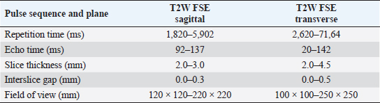 AbstractBackground: Atlanto-axial (AA) subluxation can be a complex syndrome in dogs. Accurate identification and assessment of this condition are key to providing treatment and resolution. Aim: The purpose of this retrospective study was to describe the magnetic resonance imaging (MRI) characteristics of AA subluxation and associated neurologic deficits. Methods: A multicenter review of dogs with a diagnosis of AA subluxation was conducted, evaluating signalment, neurologic grade, duration of signs, and MRI characteristics. MRI characteristics included degree of spinal cord compression and joint subluxation, integrity of odontoid ligaments, presence of a dens, spinal cord signal intensity, and presence of syringohydromyelia, hydrocephalus, and Chiari-like malformation. A control population with normal AA joints was also evaluated. MR images of 42 dogs with AA subluxation were compared to 26 age and breed-matched control dogs. Results: Affected dogs had a median age of 27 months and a median weight of 2.7 kg, and the most commonly affected breed was the Yorkshire terrier (47.5%). Spinal cord signal hyperintensity, increased AA joint size, and cross-sectional cord compression at the level of the dens and mid-body C2 were associated with AA subluxation. No associations were found between cord compression, the appearance of the dens, or cord signal intensity and neurologic grade. Affected dogs did not have a higher incidence of Chiari-like malformation, syringohydromyelia, or hydrocephalus than control dogs, and their neurologic grade was not associated with MRI findings. Lack of dens and/or odontoid ligaments was associated with larger subluxations. Conclusion: Dogs with clinical signs of AA subluxation were significantly more likely to have intramedullary hyperintensity at the level of compression ( p=0.0004), an increased AA joint cavity size ( p=0.0005), and increased spinal cord compression at the level of dens and mid-body C2 (p ≤ 0.05). The authors suggest an AA joint cavity size >1.4 mm and a subluxation distance >2.5 mm as cutoffs for MRI diagnosis of AA subluxation in dogs. No differences were noted between dogs with AA subluxation and control dogs regarding syringohydromyelia, hydrocephalus, and Chiari-like malformation. Keywords: Canine, Cervical, Congenital, Malformation, Myelopathy. IntroductionAtlanto-axial (AA) subluxation is an important cause of morbidity and mortality among small and toy-breed dogs, which are predisposed to congenital malformations of the craniocervical junction. Abnormalities associated with AA subluxation include aplasia or hypoplasia of the odontoid process, absence of the transverse ligament of the atlas or other supporting ligaments, fracture of the odontoid process, dorsal angulation, and/or separation of the dens from the axis (Oliver and Lewis, 1973; McCarthy et al., 1995; Slanina, 2015). Additional structural abnormalities reported in conjunction with AA subluxation which may impact morbidity and mortality include syringohydromyelia, incomplete ossification of the atlas, occipital dysplasia, and atlanto-occipital overlap (Cerda-Gonzalez et al., 2009). While cervical radiographs may allow preliminary diagnosis of AA subluxation, they do not demonstrate the degree of spinal cord compression or extent of congenital malformation. In humans with AA subluxation, high-resolution magnetic resonance imaging (MRI) provides reliable evaluation of the transverse and alar ligaments, as well as the spinal cord (Vetti et al., 2010). MRI in humans improves the accuracy of AA subluxation diagnosis; specifically, the combined identification of peridental effusion, lateral facet arthropathy, abnormal intramedullary intensity, and an abnormal spinolaminar line has a sensitivity of 100% and a specificity of 90% in the diagnosis of AA subluxation (Hung et al., 2010). In addition to structural abnormalities, MRI in dogs is reported to be sensitive for detecting secondary trauma to the spinal cord, as well as assessment of syrinx formation (Levistki et al., 1999). The ligamentous structures of the occipitoatlanto-axial region in the normal dog can be visualized on MRI, including the apical, alar, and transverse ligaments (Da Costa and Samii, 2010; Middleton et al., 2012). Therefore, MRI is an ideal imaging modality to evaluate the entire craniocervical junction in dogs with suspicion for, or diagnosis of, AA subluxation. The information provided by MRI of the vertebral column may be important for both diagnosis and prognosis (Sanders et al., 2004; Kent et al., 2010; Middleton et al., 2012). In a study investigating MRI characteristics of vertebral fracture or subluxation in dogs, MRI provided helpful information on the location and extent of damage to soft tissue structures and enabled assessment of spinal cord injury including parenchymal signal intensity changes, compression, spinal cord swelling, or intramedullary hemorrhage (Johnson et al., 2012). Few reports focus solely on MRI findings in dogs with AA subluxation in the veterinary literature (Warren-Smith et al., 2009; Kent et al., 2010). Aikawa et al. (2013) described the low-resolution MRI of 22 dogs with AA subluxation in a recent report on surgical technique and noted additional findings such as abnormal intramedullary signal, enlarged ventricles, caudal occipital malformation syndrome, and syringomyelia. Several dogs also had dorsal spinal cord compression identified on MRI that was not previously seen on myelography. However, to the best of the authors’ knowledge, no work has focused on the description of MRI characteristics of the AA joint in dogs with subluxation and comparison to those seen in similar clinically normal dogs. The purpose of the study reported here was to describe the MRI characteristics of dogs with AA subluxation and compare them to a control population of dogs with normal AA joints. The authors hypothesized that dogs with AA subluxation would have malformed dens, measurable increased