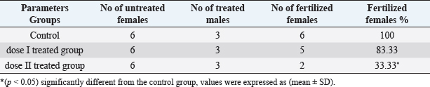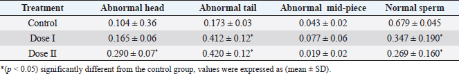 Statistical analysisAll data were analyzed using SPSS (version 20) by one-way analysis of variance (ANOVA) followed by post-hoc Duncan, s test for multiple comparisons. ANOVA was used to determine the level of significance between the control and the treated groups, p < 0.05 was considered statistically significant. The data were expressed here as mean ± standard deviation (mean ± SD). Ethical approvalEthical approval for the experimental protocol of the study was obtained from the Ethics Committee of University of Tripoli (Ref No; SREC 17-2022). ResultsEffect of different doses of DM on the level of sex hormonesNo animals died during the experimental period. The results in (Table 1) showed a significant decrease (p < 0.05) in LH level in the mice treated with dose II of DM in comparison with the control and dose I treated group. Levels of FSH and testosterone hormone declined but this reduction was not significant (p > 0.05) among the treated groups and the control group. Effect of different doses of DM on sperm morphologyMorphological analysis of sperm in this study revealed a significant decrease (p < 0.05) in the percentage of spermatozoa with normal morphology in all treated groups compared to the control group. A significant increase (p > 0.05) of sperm with abnormal heads was recorded in the dose II treated group as compared to the control and dose I treated groups. A significant increase (p < 0.05) in the percentage of sperm with abnormal tails was observed in all treated groups compared to control (Table 2). DM had no effect on the percentage of sperm with abnormal mid-piece (p > 0.05) (Table 2). The types of abnormal sperm in this study included sperm with abnormal tails and sperm with abnormal heads compared to normal morphology of sperm (Figs. 1–3). Effect of different doses of DM on the fertilityThe results showed that fertility reduced significantly with treated males when mated with normal virgin females (Table 3). Effect of different doses of DM on embryos of untreated females impregnated by DM-treated malesThe results revealed a significant increase (p < 0.05) in the average number of dead embryos of females impregnated by treated males with dose II of DM and a significant decrease (p < 0.05) in the average number of live embryos of females impregnated by treated males. The body length of embryos of females impregnated by males received DM did not record any significant differences (p > 0.05) when compared to embryos of females impregnated by males of the control group (Table 4). DiscussionThis study was conducted to assess the effects of oral administration of DM on sperm morphology, sex hormones, fertility, and embryos. Our results demonstrated that administration of the recommended dose and the double recommended dose of DM pesticide to male mice caused a significant decline in LH level in the group treated with dose II and non-significant changes in the levels of FSH and testosterone in the treated groups as compared to the control. Similar results were done by Choudhary et al. (2008) and Joshi et al. (2007) revealed that DM led to a decrease in LH level. Ali and Ibrahim (2018) reported that exposure of male mice to pesticide malathion resulted in a significant decline in LH hormone. The reduction in LH level may be attributed to the effect of organophosphorus pesticides including DM on the pituitary-testicular axis (Tarmura et al., 2001; Verma and Mohanty, 2009), or by disrupting the central nervous system (Colborn, 2006) via suppression of releasing of brain’ hormones which stimulate FSH and LH secretion (Tarmura et al., 2001). Our study contradicted previous studies indicating that exposure of male rats to malathion pesticides (Ali and Ibrahim, 2018) and dichlorvos pesticide (Ezeji et al., 2015) caused a drop in testosterone levels. Zidan (2009) stated that treatment of male rats with mixed pesticides (chlorpyrifos, diazinon, and profenofos) added to powdered food at concentrations of 5 and 50 ppm of each pesticide for 65 days, led to a decrease in the serum testosterone in all treated groups and FSH level decreased with the highest concentration of the tested pesticides. This controversy in results among different studies may be attributed to the type of pesticide, the period of treatment, route of administration.