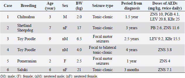 AbstractBackground: The anti-epileptic effects of docosahexaenoic acid (DHA) in dogs and humans remain controversial. The dosage and efficacy of DHA were various in the previous reports. Aim: The effects of high-dose DHA supplementation as add-on therapy for idiopathic epilepsy in dogs were evaluated. Methods: An open-label clinical trial was designed in this pilot study. Six dogs (median age: 6 years) with idiopathic epilepsy were included. All the patients were diagnosed with idiopathic epilepsy using magnetic MRI and cerebrospinal fluid examination (median: 2.0 years before the trial). They had 5–45 seizures and/or auras (median: 9.0) in the month before starting DHA supplementation. DHA was adjunctively administered at doses of 69–166 mg/kg/day without changing other prescriptions. Results: Four of the six patients completed the 6-month observation period. All the patients showed a decrease in seizure frequency of 50% or more within 2–3 months after the start of the administration, and three patients decreased to a frequency of 0–1 per month after 5–6 months. No clear adverse events were observed in the general condition or blood test results in any patients. Conclusion: Although the sample size was small and the study was not a randomized controlled trial, the data suggest that add-on supplementation of DHA could be useful in reducing the frequency of seizures in canine idiopathic epilepsy. Keywords: Docosahexaenoic acid, Dogs, Drug-resistant epilepsy, Idiopathic epilepsy, Omega-3 fatty acids. IntroductionIn dogs, idiopathic epilepsy is a condition of repeated seizures in which there are no organic lesions in the brain and no clear origin of the seizures (Berendt et al., 2015). This form of epilepsy is one of the most common chronic neurological disorders observed in dogs. Although prevalence varies depending on the study, it has been reported to be from 0.62% to 1.84% (Kearsley-Fleet et al., 2013; Heske et al., 2014; Hamamoto et al., 2016). The International Veterinary Epilepsy Task Force published a consensus statement regarding the treatment of idiopathic epilepsy in dogs (Sofie et al., 2015). In many cases, the frequency of seizures can be sufficiently reduced by prescribing antiepileptic drugs (AEDs) according to guidelines. However, in less than 30% of these cases, the frequency and severity of seizures cannot be reduced even with multiple AEDs (Trepanier et al., 1998). Therefore, the development of medications that support the action of AEDs has garnered significant research attention with the goal of improving quality of life. Docosahexaenoic acid (DHA) is an omega-3 fatty acid abundantly found in blue fish and crustaceans. Although DHA intake is known to have a positive effect on brain function (Lauritzen et al., 2016), its association with neural diseases such as epilepsy remains controversial. In a 2018 systematic review, four of nine studies in human patients reported a significant positive association between omega-3 fatty acids and epileptic seizures; however, the authors could not conclude a beneficial effect because of the low statistical power (Pourmasoumi et al., 2018). Another clinical study of 99 patients reported that the administration of DHA at a dose of approximately 33.4–49.1 mg/kg/day reduced the frequency of seizures in patients with refractory epilepsy (Ibrahim et al., 2018). Two papers have been published on the administration of omega-3 fatty acids for idiopathic epilepsy in dogs; however, the AEDs of DHA have not been clearly indicated (Scorza et al., 2009; Matthews et al., 2012). In these studies, dogs were administered 2 g/head/day of whole omega 3 fatty acid and 25 mg/kg/day of DHA, respectively, which were lower doses than those reported in humans, and the ratio of DHA components to fatty acids was ambiguous in one study (Scorza et al., 2009). In addition, the NOAEL of DHA + EPA in healthy dogs has been reported to be sufficiently higher than these doses (Takeda Pharmaceutical Company, 2020), suggesting that DHA can be safely administered at higher doses than those reported in previous studies. Therefore, we conducted an open-label clinical trial to clarify the effects of supplemental treatment with a high dose of DHA in dogs with idiopathic epilepsy. Materials and MethodsInclusion criteriaAnimals that had been in regular follow up at the center were enrolled in the trial between 2019 and 2021 (Table 1). The inclusion criteria were as follows: 1- to 10 -year-old dogs; clinically diagnosed with idiopathic epilepsy; that had been on AEDs at the same dose(s) for at least 2 months; and had seizure and/or aura episodes more than twice per month. The diagnosis of idiopathic epilepsy (with a Tier II confidence level) was concluded in accordance with the guidelines of the International Veterinary Epilepsy Task Force (De Risio et al., 2015) as follows: absence of neurological abnormalities during the interictal period; unremarkable results of cranial MRI examination; and reactive seizures ruled out via medical records, physical examination, and blood examination. As part of the selection process, the trial was discussed with the owners, and consent was obtained. Six dogs were identified as fit and enrolled in the trial (Table 1). ProcedureDHA supplements (DHA70 BAPT, Bizen Chemical, Okayama, Japan) were prescribed at a dose of 50–100 mg/kg to be taken every 12 hours (100–200 mg/kg/day) for 6 months. The DHA capsules were oval in shape, measuring 13 mm long and 7.5 mm in diameter. During the trial period, the owners were advised to continue administering AEDs that had been prescribed prior to the study. Follow-up visits were performed each month to check for the following: seizure episodes, vital signs, physical assessment, and changes in patient behavior/activity. Clinical pathology, including routine complete blood count, alanine aminotransferase (ALT), alkaline phosphatase (ALP), blood urea nitrogen (BUN), and creatinine (CRE) was assessed