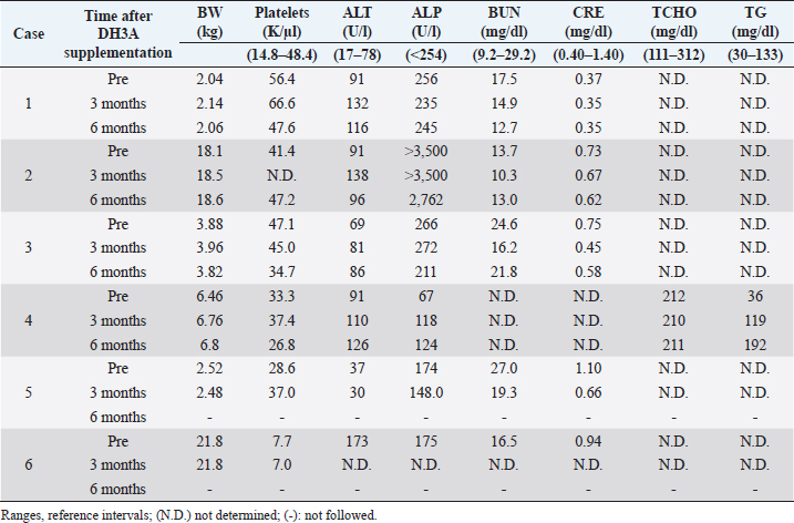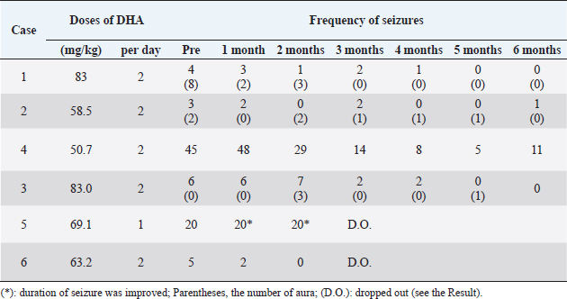 The assessment of seizure activity revealed that all remaining animals receiving DHA supplementation showed improvements in the frequency and severity of seizures and auras (Table 2). They had 5–45 seizures and/or auras (median: 9) within 1 month of starting DHA supplementation. They were treated at doses of 41.5 to 83 mg/kg once or twice daily in total 69.1 to 166 mg/kg/day of DHA (median, 109.2 mg/kg/day). Four of the six dogs completed the 6-month observed period without changes in medication. The seizure frequencies of all patients decreased by 50% or more by 2–3 months after the start of DHA supplementation, and those of three patients decreased to 0–1 per month at 5–6 months. Statistical analyses using the Friedman test ( p=0.00249) showed differences in seizure frequency among the groups at the time of the trial. Further analyses using the Nemenyi post-hoc test ( p=0.0338) revealed that the total frequency of seizures and auras was significantly different between the pre-trial period and at 5 months after the start of supplementation. The results of body weight and blood examination tests are shown in Table 3. Adverse events related to supplementation were not observed in any cases. No problems were identified during physical examinations or follow-up interviews. Two patients had to be withdrawn from the trial. Case 5 was a 2-year-old intact female Pomeranian dog with a history of focal motor seizures. She was administered oral DHA supplementation at an inappropriate dose of 69.1 mg/kg once daily instead of twice due to miscommunication. Owing to the size of the DHA capsule, the owner struggled to administer it. The veterinarian advised the owner to decapsulate it and mix the contents with the feed; however, it appeared that the patient missed the appropriate amount of DHA despite multiple attempts during the observation period. The owners were not able to record the precise number of seizures at the time of the trial but felt that the severity and frequency of seizures decreased. After consulting with a veterinarian, the patient withdrew from the program. Case 6, a 6-year-old neutered female Saluki dog with tonic-clonic seizures, was also excluded from the trial due to an alteration in AED medication. Prior to withdrawal, the seizure activity of the patient had apparently reduced at a dose of 63.2 mg/kg twice daily. DiscussionIn this study, an open-label clinical trial was conducted on six dogs with idiopathic epilepsy. Four of the six patients completed the 6-month observed period without changes in their primary AED regimens. All dogs showed a decrease in seizure frequency of 50% or more at 2–3 months after the start of administration, and three of the four dogs decreased to 0–1 per month at the end of the study period. These data suggest that DHA may be a useful supplement for treating canine idiopathic epilepsy. While statistical changes were observed, the sample size was small, and the power was quite low. A large-scale trial is needed to verify the effectiveness of DHA as a supplement for idiopathic epilepsy in dogs. Table 2. Effects of DHA supplementation on seizure frequency.