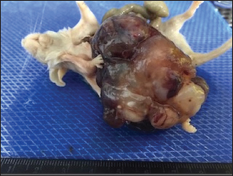 AbstractBackground: Teratomas are rare types of germ cell neoplasms composed of various differentiated or undifferentiated tissues. Case Description: A 25-week-old female control FVB /n mouse in a 4-week toxicity study presented abdominal distension and poor body condition. It was euthanized, and the necropsy examination revealed a large mass connected to the tip of the right uterine horn, occupying the entire abdominal cavity. Microscopically, this mass showed areas of epidermal differentiation, with laminated keratin and sebaceous glands, differentiation into respiratory and digestive epithelium, cartilage, bone, and extensive areas of differentiation into the nervous tissue, being classified as an ovarian teratoma. Conclusion: As far as authors know, the occurrence of ovarian teratomas in the FVB/n mouse strain has never been previously described. Keywords: Mouse, Ovary, Rodent, Teratoma. IntroductionMice and rats make up approximately 95% of all laboratory animals, making the mice the most used animals in biomedical research (Hickman et al., 2017). The analysis of the published works regarding the development of spontaneous tumors in laboratory animals, particularly in the mouse, reveals their low incidence. These values may result from two different situations: either the incidence of spontaneous tumors is very low, or many small or microscopic tumors are not identified because tissues are not collected by routine. As a standard procedure, our research team performs a complete necropsy of all animals that die during experimental trials or those must be sacrificed before the scheduled date (due to humane endpoints). Thus, with the support of experienced pathologists, we have identified several undescribed tumors in rodents, such as a Zymbal tumor in a male Wistar rat (Faustino-Rocha et al., 2023) and a Schwannoma in a female Sprague–Dawley rat (Teixeira-Guedes et al., 2014). According to Gopinath (1994), the incidence of tumors in control animals during experimental protocols is influenced by the pathologist's experience. From our perspective, the incidence of spontaneous tumors in laboratory animals is also associated with the perspicacity of researchers and animal caretakers. Thus, we recommend that all animals in experimental trials, regardless of the cause of their death, should constantly be subjected to a careful and complete necropsy, and their organs should be analyzed by an experienced pathologist. With this approach, we will be able to understand the rate of spontaneous tumors in laboratory animals. Although spontaneous tumors are rare in laboratory animals, it is important to obtain data about their occurrence during their life, because spontaneous tumors observed before the end of a study may avoid a misinterpretation of the data (Son and Gopinath, 2004). Herein, for the first time, we describe a case of a spontaneous teratoma in a female FVB/n mouse. Case DetailsAnimalsTwenty female, 25-week-old FVB/n mice were used in a toxicity study for the safety assessment of a natural compound, the hydroethanolicc French Lavender extract (data not published). This animal belonged to the control group and was not exposed to the extract. These mice were housed in polycarbonate cages, under controlled conditions of humidity (50% ± 10%), temperature (23°C ± 2°C), air system filtration (10–20 ventilations/hour), and on a 12/12 hours light/dark cycle, and were allowed free access to standard laboratory diet (4RF21, Mucedola, Italy) and tap water. During the experimental assay, animals were observed and handled daily. On abdominal palpation, a large mass was detected in the abdomen of one mouse; its body weight was 50.1 g, while the average body weight of the other females was 25.2 g. The animal exhibited poor body condition, and, considering our humane endpoints, it was sacrificed by anesthetic overdose. The animal was subsequently subjected to a careful postmortem examination. Gross pathological examinationDuring the necropsy, a large mass connected to the right uterine horn was observed, occupying the entire abdominal cavity, measuring 5.5 × 3.5 × 2.8 cm in its largest dimensions and weighing 20.6 g (Figs. 1 and 2). This mass consisted of multiple cysts, the largest measuring 2.8 × 2.0 cm, with brownish content, and small whitish solid areas. The contralateral ovary showed no macroscopical alterations. The stomach was atrophied by compression, and the remaining organs did not show significant changes. The mass and all organs were fixed in 10% buffered formalin for 24 hours for histopathologic examination. Histopathological examinationThe specimens were processed for a routine histopathology examination. After sample fixation, they were cut using a microtome. Histological sections were then prepared and stained with hematoxylin and eosin (H&E).