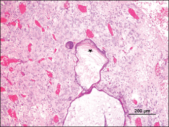 Fig. 5. Keratinized epithelium with an accumulation of laminated keratin (*), surrounded by well-differentiated nervous tissue (H&E).