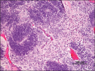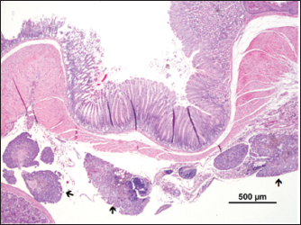 Fig. 7. Metastasis on gut serosa ( ) (H&E). DiscussionThe word “teratoma” is derived from the Greek word “teraton,” meaning monster, and it was coined by Virchow in 1863 (Comerci et al., 1994). Teratomas are complex neoplasms arising from more than one embryonic germ layer, composed of a variety of unorganized, differentiated, or undifferentiated tissues originating from ectoderm (hair, teeth, and nervous tissue), mesoderm (fibrous or adipose tissue, bone, muscle, and cartilage), and endoderm (respiratory tissue and salivary gland) (Sirivisoot et al., 2022). Most teratomas arise in the gonads, though occasionally, they may develop in extragonadal sites, such as the anterior mediastinum, retroperitoneal, and gastrointestinal tract. Extragonadal teratoma develops from primordial germ cells misplaced during their migration to gonads (De Felici et al., 2021; Sirivisoot et al., 2022). Two types of teratomas have been described: mature and immature. The mature teratoma is frequent, representing 50% of all ovary tumors, while the immature ones are scarce, representing only 1% (Saba et al., 2009). According to the ratio between dedifferentiated or incompletely differentiated and well-differentiated cell populations, biological behavior might range from benign to malignant (Sirivisoot et al., 2022). Mature teratomas are usually benign, but in 0.1%–0.2% of cases, they may undergo malignant transformation (Giustini et al., 1978). Teratomas are rare lesions in domestic animals. Nevertheless, gonadal teratomas are more common in bitches (Agnew and MacLachlan, 2016) and guinea pigs (Barthold et al., 2016), but rarely documented in other species, such as horses (Lefebvre et al., 2005), heifers (Carluccio et al., 2017), and cats (Sirivisoot et al., 2022). Considering laboratory animals, ovarian teratomas were defined as very rare in female rats (Tsubota et al., 2004). The first ovarian teratoma in mice was described by Slye et al. (1920). Afterward, ovarian teratomas were identified in a C3H female mouse by Jackson and Brues (1941); in Swiss albino mice by Fawcett (1950); and in C3HeB mice by Fekete and Ferrigno (1952). Thiery (1963) reported two cases of ovarian teratoma in C3H/N mice occurring in his colony: the first was identified in a 6-month-old breeding mouse and the second was reported in a virgin mouse. In this last case, the uterine cervix had been painted twice a week for 18 weeks with a 1% suspension of 3,4-benzopyrene in acetone to induce cervicovaginal cancer and had ingested 0.8 mg of estriol. According to Stevens and Varnum (1974), between 1920 and 1974, nine cases of teratomas were described in the following mice strains: C3H, Swiss Albino, C3HeB, C3H/N, CBA/J, and DBA/2J. Considering how relevant this tumor is in obstetrics and gynecology medicine, these researchers tried to develop an animal model to study ovarian teratoma in the LT mouse strain. However, ovarian teratomas of LT female mice were benign and composed of multiple types of well-differentiated tissues of embryonic and extraembryonic origin (Stevens and Varnum, 1974). Damjanov et al. (1975) described ovarian teratomas from 8, 9 to 10-week-old mice from a large colony of LT mice. Tumors were unilateral in all animals, except for one case that presented bilateral teratomas. In 1987, an analysis of the incidence of ovary teratoma in the B6C3F1 female mice was made and an incidence of 13.8% was reported (Alison and Morgan, 1987). More recently, Naser et al. (2021) crossed LT-ett1 and a previously established LT-Ter strain to develop the double-congenic strain LT-Ter-ett1. Furthermore, they also found a strain with a point mutation in the MC4R gene of the LT strain by genome editing, LT-MC4RG25S, and developed a double genetically modified strain LT-Ter-MC4RG25S to address the relation between Ter and MC4R genes. They observed the development of ovarian teratomas in all strains and concluded that MC4R is one of the genes responsible for forming ovarian teratomas (Naser et al., 2021). Although some reports of spontaneous ovarian teratomas in several strains of laboratory mice have appeared in the literature over the years, no reports were found in FVB/n mice. In the present case, for the first time, an ovarian teratoma was identified in a female laboratory FVB/n mouse, consisting of tissues originating from the three embryonic layers (endoderm, mesoderm, and ectoderm). The presence of invasive neoplasia and peritoneal carcinomatosis lesions confirms its malignant character. Though metastasis is rare, intra-abdominal metastasis was also reported to be associated with immature cat teratomas (Sirivisoot et al., 2022). AcknowledgmentNone. Conflict of interestThe authors declare that they have no conflict of interest. Author contributionsPaula A. Oliveira performed the experimental design, supervised the animal experiments, participated in animals’ sacrifice, and wrote the manuscript; Rui M. Gil da Costa made the histopathological diagnosis and wrote the manuscript; Elisabete Nascimento-Gonçalves conducted experiments with live animals and wrote the manuscript; Ana I. Faustino-Rocha conducted experiments with live animals and wrote the manuscript; Ana Margarida Calado made the histopathological diagnosis and wrote the manuscript; Adelina Gama made the histopathological diagnosis and wrote the manuscript; Catarina Jota Baptista wrote and revised the manuscript; Fernanda Seixas participated in animals’ sacrifice, made the histopathological diagnosis and wrote the manuscript. FundingThis work was supported by National Funds by the Portuguese Foundation for Science and Technology (FCT). The authors of the research unit CITAB received funding from FCT; reference of the projects UIDB/04033/2020 and LA/P/0126/2020. The authors of the research unit CECAV received funding from FCT; reference of the projects UIDB/CVT/00772/2020 and LA/P/0059/2020. ENG thanks FCT/MCTES and European Social Funding (EFS) through NORTE2020 for her Ph