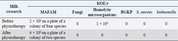 Fig. 5. The number of colonies grown on MPA before and after the physiotherapy procedure. Table 4. Terms of recovery of cows of the control and experimental groups.