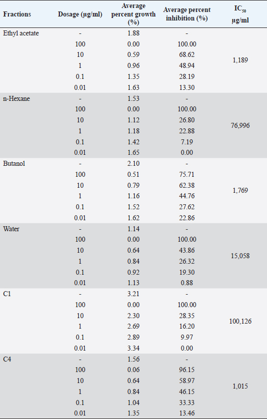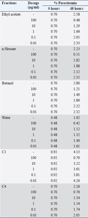 Then, the SPSS 15 probit analysis program is used to determine the IC50 value. ResultsResults of activity test of antimalarial in vitro with the culture of P. falciparum strain 3D7 using the Trager and Jensen (1976) methods. The results of the percentage of parasitemia, percentage of growth, percentage of inhibition, and IC50 P. falciparum 3D7 are shown in Tables 1 and 2. Results extract fractionated with technique partition liquid–liquid. The results of the fractionation process graded from the fraction test are shown in Table 3. Table 1. The average percent of parasitemia of P. falciparum 3D7 gives a fraction of S. cumini L extract in vitro.