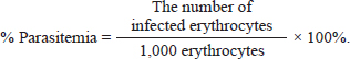 The calculation of parasitemia percentage was made in 1,000 erythrocytes using a light microscope with 1,000× magnification, the growth and the percentage of inhibition were done with the following equation (Inbaneson et al., 2013):