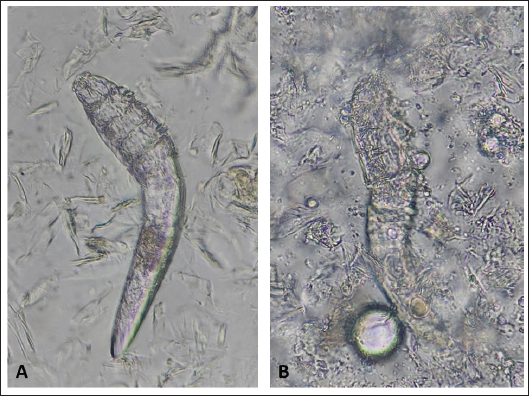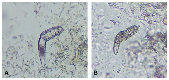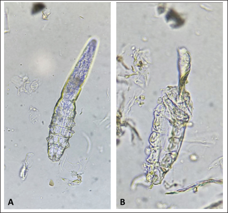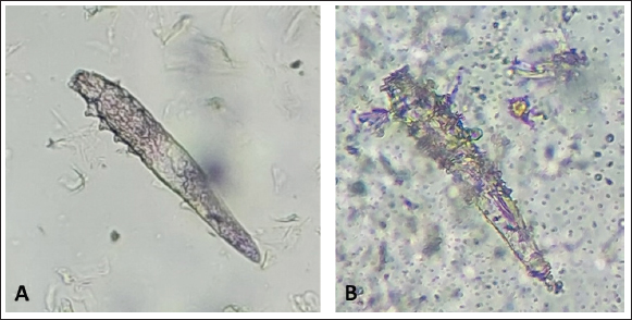 Fig. 4. (A) Alive mite in mineral oil group before treatment. (B) Dead, opisthosoma wrinkling, and clarification of the opisthosomas cuticle in mites were also followed by the microscopic observation at the magnification of 40 × after 24-hour mineral oil use on D. canis. DiscussionThese days, synthetic acaricides are becoming increasingly problematic due to some health problems and the expense of these products, especially in developing countries. There are a lot of treatment options for canine generalized demodicosis but many of them are not licensed for the treatment and may have poor efficacy and narrow safety margin (Perego et al., 2019). Therefore, novel resources including plant essential oils and plant-derived bioactive compounds could have the potential to be suggested as an alternative treatment for Demodex spp. The initial result of the study demonstrated that carvacrol as a phenolic monoterpene was effective against D. canis and it could be widely used in demodicosis like amitraz without critical side effects. The combination of Carvacrol + Amitraz also had a reasonable effect against demodicosis, and in the belief of authors, mites removal from the skin with this mixture (1:1) could be more beneficial. Skin-penetrating enhancement of carvacrol could induce a synergistic implication on perilous demodicosis. Although the clinical effect of carvacrol was better than the mixture solution group, it is based on the volume of solution that became half in the mixture group and did not express the carvacrol superiority over than mixture group. Both treatment groups had better outcomes than the mineral oil (negative group) and Amitraz 0.05% (positive group), respectively. Our data are consistent with the reports of Akkucuk and Kaya (2022) concerning investigating the effects of some essential oils, especially thyme oil on D. folliculorum, where the results showed that 1% concentration of thyme oil had a more effective killing time than 5% concentration of tea tree oil and sage oil, and a significant difference was found ( p < 0.0001). Carvacrol has been identified as the most prevalent active ingredient of thyme essential oil at a concentration of 59.93%, analyzed by gas chromatography–mass spectrometry method in this study (Akkucuk and Kaya, 2022). Numerous studies evaluated in vitro and in vivo acaricidal activity of several essential oils against D. folliculorum and D. brevis with different numbers of enrolled mites and different efficacy (Gao et al., 2005, 2012; Kim et al., 2011; Zhao et al., 2011; Koo et al., 2012; Tighe et al., 2013). A study on the in vitro sensitivity of D. canis to the different concentrations of tea tree oil was conducted by Neves et al. (2020), and the results showed that the higher concentration of the oil (100%), had more quickly lethal effects on mites and also lowest concentration (3/13%) killed mites faster than the positive control group (amitraz 0/05%). This was the first in vitro study of using essential oils on D. canis. We conducted some of this study procedure such as sampling and microscopy following our recent study. In another study, Li et al. (2021) revealed that carvacrol, eugenol, and geraniol possess significant ovicidal activities against Sarcoptes scabiei eggs and at the test concentration of 5%, the ovicidal activity of carvacrol, eugenol, and geraniol was 100%, 100%, and 91.7%, respectively. The median effective concentration to obtain 50% egg mortality (EC50) was 0.5%, 0.9%, and 2.0% for carvacrol, eugenol, and geraniol, respectively. The microscopic images of eggs after each treatment indicated that terpenes may act by penetrating through the aeropyles on the egg surface (Li et al., 2021), it seems that opisthosomal cuticle of D. canis mites clarified and wrinkled after contact with the carvacrol by the same manner. The ovicidal activity of carvacrol also has been reported in castor bean tick, Ixodes ricinus (Acari: Ixodidae) (Tabari et al., 2017). Carvacrol also showed acaricidal activity in a contact assay, with LC50 of 0.26% at 24 hours and in a fumigation bioassay, killed all Psoroptes ovis mites within 50 minutes of exposure (Chen et al., 2019). The present study demonstrated that the combination of Carvacrol + Amitraz had efficient miticidal activity but in comparison with carvacrol, this combination showed a longer time in killing all D. canis mites. It can be due to the lesser volume of carvacrol in the combination of Carvacrol + Amitraz. In this study, amitraz was prepared at a concentration of 0.05% and selected as a positive control because it is an FDA-approved treatment for canine demodicosis and also it is a topical agent that can be combined with other acaricides or insecticides. Therefore, amitraz was chosen as the positive control. However, amitraz showed acaricidal action with less variation between replicates, but the killing times of mites in the amitraz group were longer than both carvacrol 5% and the combination of Carvacrol + Amitraz groups. Mineral oil has no proven acaricidal action. In the in vitro study of Akkucuk and Kaya (2022) mean survival time of D. folliculorum in contact with mineral oil was about 13,596 ± 3,827 minutes. In the present study, mites in the mineral oil group were alive for more than 24 hours, but after 48 hours, some of them were dead due to dehydration and lack of nutrition. Carvacrol, in a concentration of 5%, shows satisfactory acaricidal effects on D. canis mites in this in vitro study and we do not observe prominent synergistic effects in the combination with Carvacrol + Amitraz. In addition, it is the first time that carvacrol as a monoterpenoid found in herbs evaluated against D. canis mites in combination with amitraz as a selected acaricidal treatment and alone. However, different concentrations of carvacrol in different severity of demodicosis can be a good suggestion for further studies, but carvacrol can be introduced as a reliable and economical herbal product for the c