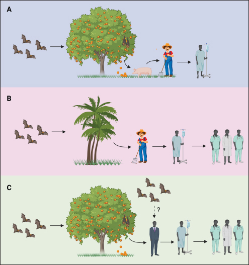 Fig. 2. Transmission routes of NiV. (A) In Malaysia, bat-bitten fruits contaminated with NiV-M were consumed by pigs, and workers handling the pigs were infected with NiV-M. (B) In Bangladesh, bat saliva- and excreta-contaminated palm sap consumption led to NiV-B infection in humans and was spread further via nosocomial mode. Infected bats shed the virus in their urine, excreta, and saliva. (C) In India, the possibility of direct bat-to-human transmission has been reported in Kerala state, but this was not supported by adequate evidence. Nosocomial spread of NiV-B has been reported in two different states—Kerala and West Bengal. Considering the limited therapeutic options available for NiV, recent efforts have focused on evaluating the potential of alternative antiviral drugs. Among these, remdesivir, an adenosine nucleoside antiviral drug, has shown promise in preclinical studies in African green monkeys. Notably, when African green monkeys were treated with remdesivir, only two out of four animals developed mild respiratory symptoms, whereas all untreated animals exhibited severe respiratory symptoms, highlighting the potential efficacy of remdesivir against NiV infection (Lo et al., 2019). It is worth mentioning that remdesivir has gained significant recognition in the field of viral therapeutics, as it has received approval from the United States Food and Drug Administration for the treatment of SARS-CoV-2 infection. Moreover, numerous countries, including Bangladesh, Singapore, Taiwan, India, Japan, and Australia, have authorized its emergency use, further attesting to its therapeutic potential (Beigel et al., 2020). During the NiV outbreak in Singapore in 1999, a combination therapy consisting of acyclovir (Zovirax) and ceftriaxone was administered to nine abattoir workers, resulting in a remarkable survival rate of eight out of nine individuals (Paton et al., 1999). However, it is worth noting that no in vitro data are available regarding the effectiveness of acyclovir against NiV. In contrast, favipiravir, marketed as Avigan, has demonstrated inhibitory effects on NiV replication in in vitro studies (Srinivasan and Rao, 2021). Moreover, in a hamster model study, favipiravir exhibited the highest antiviral activity against NiV infection compared with other compounds (Dawes et al., 2018). Another potential therapeutic candidate, rintatolimid (Ampligen), an immunomodulator, has shown efficacy in inhibiting NiV replication and in providing protection against viral challenges in hamsters through the induction of IFN-α and IFN-β (Georges-Courbot et al., 2006). Nonetheless, it is imperative to highlight the need for further comprehensive investigations to establish solid evidence regarding the efficacy of antiviral drugs suitable for the treatment of NiV infections in humans. Currently, available in vitro and in vivo studies are limited. Continued research efforts are warranted to identify and develop effective treatment options against NiV infections (Liew et al., 2022). Early diagnosis The early and accurate diagnosis of NiV infection plays a pivotal role in mitigating the significant fatality rate associated with this disease. To achieve this objective, a comprehensive diagnostic approach encompasses the collection of diverse specimens from both infected individuals and animals. In human patients, various samples such as nasal swabs, throat swabs, urine, blood, and cerebrospinal fluid (CSF) are obtained for diagnostic purposes (Mazzola and Kelly-Cirino, 2019). Similarly, deceased animals provide valuable diagnostic specimens, such as lungs, spleen, and kidneys, which aid in the identification and isolation of NiV (Daniels et al., 2001). Diagnostic procedures for NiV are conducted in highly controlled and specialized facilities, specifically in enhanced Biosafety Level 3 (BSL3+) or Biosafety Level 4 (BSL4) laboratories. A range of diagnostic tests is available for the detection of NiV, including molecular and serological assays, immunohistochemistry, histopathology, virus isolation, and neutralization techniques (Mazzola and Kelly-Cirino, 2019). Notably, Vero cells are employed for the cultivation of NiV, with observable cytopathic effects typically manifesting within a three-day timeframe (Daniels et al., 2001). Among the various diagnostic methods available for NiV detection, polymerase chain reaction (PCR) is the most preferred and highly sensitive. This molecular approach utilizes reverse-transcription PCR (RT-PCR) and nested PCR, targeting conserved segments of the viral genome, namely N, M, and P (Mazzola and Kelly-Cirino, 2019). In particular, real-time RT-PCR, despite its relatively high cost, is widely used because of its exceptional sensitivity, enabling accurate and efficient NiV detection and diagnosis (Wang and Daniels, 2012). The utilization of PCR-based methods, particularly real-time RT-PCR, has revolutionized the field of NiV diagnostics by providing rapid and highly sensitive results. In addition to traditional diagnostic approaches, next-generation sequencing (NGS) has emerged as a valuable method for accurate identification of NiV strains. Although NGS offers substantial benefits in terms of strain characterization, its utilization in routine diagnosis is limited owing to cost considerations (Mazzola and Kelly-Cirino, 2019). Alternatively, immunohistochemistry is a safe and reliable method for NiV detection, particularly when using formalin-fixed tissue samples (Wang and Daniels, 2012). The enzyme-linked immunosorbent assay (ELISA) plays a crucial role in the detection of NiV antigens and antibodies in serum samples. ELISA is an effective and widely employed technique that is often followed by confirmatory tests such as serum neutralization or PCR to enhance diagnostic accuracy (Daniels et al., 2001). In addition, virus isolation and neutralization methods are utilized for NiV diagnosis; however, their implementation is restricted to high-containment BSL4 facil