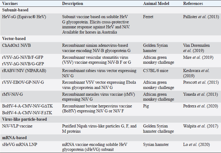 Table 3. Different vaccine prototypes are under development for NiV infection.