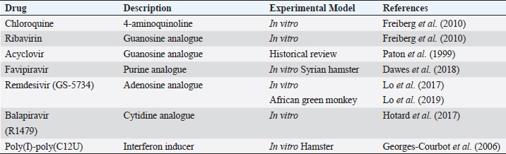 To address the seemingly heightened pathogenicity of NiV-B compared to NiV-M, a vaccine specifically targeting NiV-B was constructed utilizing rVSV that expressed either the G or F protein. Following vaccination, all animals developed NiV-B-neutralizing antibodies within three weeks. Upon subsequent challenge with NiV-B, the mice demonstrated remarkable survival without any evidence of infection (Mire et al., 2019). An examination was conducted to explore the potential of a live attenuated rabies virus-based vaccine as a preventive measure against NiV in wildlife. This approach capitalizes on robust humoral immune responses elicited by vaccines based on the rabies virus. The inclusion of the NiV-B glycoprotein G within the rabies virus vector resulted in seroconversion in mice subjected to the vaccination regimen (Keshwara et al., 2019). The authors proposed the development of a live-attenuated rabies-NiV hybrid as a promising vaccine candidate for wildlife, offering the potential for dual protection against both rabies and NiV (Keshwara et al., 2019). Virus-like particles (VLPs) offer a promising approach to vaccine development as they elicit robust immune responses by presenting both native F and G glycoproteins without the potential risks associated with using complete virions. A study conducted on Syrian golden hamsters demonstrated the protective efficacy and induction of neutralizing antibody titers by a vaccine based on NiV VLPs (Walpita et al., 2017). In addition, an mRNA vaccine encoding the soluble subunit of the HeV glycoprotein is currently in the developmental stage and exhibits partial protection against NiV infection in Syrian hamsters (Lo et al., 2020). Further preclinical and clinical investigations are necessary to validate the effectiveness of these vaccine constructs. Anti-NiV therapeutics Several antiviral agents have been investigated for their potential in treating NiV infection, although only a limited number have been evaluated in animal model studies (Table 4). Notable examples include ribavirin, remdesivir, and favipiravir. Ribavirin was one of the first antiviral drugs used against NiV. During the outbreak in Malaysia between 1998 and 1999, ribavirin treatment resulted in a 36% reduction in the mortality rate of 140 NiV-infected patients (Goh et al., 2000). However, in vitro evaluation using a combination of ribavirin and chloroquine in hamsters did not yield a significant reduction in mortality (Freiberg et al., 2010). The efficacy of ribavirin was further examined during the 2018 NiV outbreak in Kerala, where oral ribavirin was administered to six patients, but only two survived (Banerjee et al., 2019).