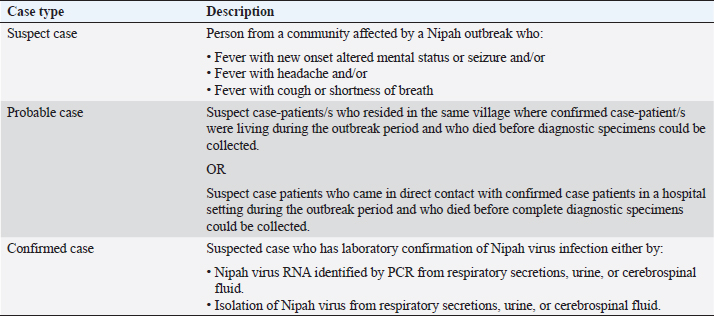 Table 5. Surveillance case definitions for Nipah virus infection as defined by the National Centre for Disease Control, India.