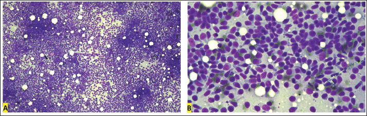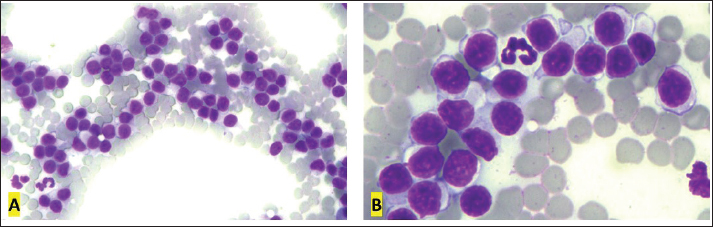 Fig. 5. Myelogram, Golden Retriever, T-zone lymphoma. (A) Bone marrow particle. In this sample, the cell:fat ratio was estimated at 60%. 4× objective. (B) In the region around the particles, a concentration of 22.8% of typical small lymphocytes was observed. 40× objective. Diff-Quik staining. In peripheral blood immunophenotyping, the lymphocyte gate, which represented 80.9% of the nucleated cellularity, resulted in a CD5+phenotype in almost 100% of cells (Fig. 6.1). However, only 2.5% and 2.2% of these cells were CD4+ and CD8+, respectively. In addition to this atypia, 69.7% of cells were CD45-. Similar results were observed in lymph nodes and bone marrow immunophenotyping (Fig. 6.2 and 6.3). These results are summarized in Table 1. Based on the cytological and immunophenotypic characteristics, a diagnosis of TZL was confirmed, and conservative treatment was instituted with 2 mg of chlorambucil (4 mg/m² EOD, continuous use) and 20 mg of prednisolone (1 mg/kg SID for 7 days, then 0.5 mg/kg SID for 14 days, followed by 0.5 mg/kg SID every 48 hours for another 30 days). After diagnosis and treatment initiation, the dog returned for evaluation, and monitoring blood tests were performed (Table 2). In the first month of treatment, the animal presented with moderate anemia, with hematocrit values ranging from 26% to 27% in three tests. A single dose of oral lomustine was administered, at 60 mg/m2 in the second week but despite no adverse events, there was no improvement in the hematological parameters. The dog remained asymptomatic during the entire treatment and follow-up. Anemia became mild in the second month of treatment (hematocrit 35%), reaching normocytosis in the fourth month, with hematocrit 40%. Thereafter, the hematocrit oscillated near the lower limit of the reference range, being within the reference range in the last blood test (hematocrit 44%), performed after 15 months of follow-up. The anemia in the first and second months of treatment was accompanied by extreme leukocytosis of over 200,000 cells/µl, constituted by 88% to 99% lymphocytes with the same characteristics as the first blood test. In the fourth month of treatment, the erythroid normocytosis was accompanied by a decrease in leukocyte count to 89,000 cells/µl, still with 91% of lymphocytes. From the fifth month, leukocytosis became moderate and decreased until it reached a count of leukocytes within reference values (14,400 cells/µl) (Fig. 7A and B). In this test, lymphocytes represented 75% of leukocytes, with morphology similar to the first test. Pearson correlation test showed a strong negative correlation between hematocrit and leukocyte count (p=0.0009; rP=−0.851), and hematocrit and lymphocyte count (p=0.001; rP=−0.836).