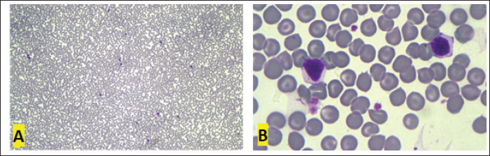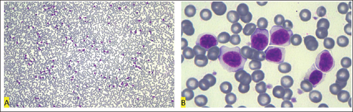 Fig. 2. First blood smear, Golden Retriever, T-zone lymphoma. (A) Low red blood cell:white blood cell ratio (37:1) due to intense leukocytosis (5,940,000 RBCs/μl and 160,050 WBCs/μl). 10x objective. (B) “Clear cells” are small to intermediate and have clear and more abundant cytoplasm than typical lymphocytes. 100× objective. Diff-Quik staining.