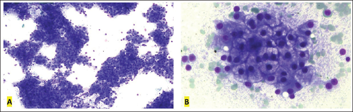 Fig. 4. Liver cytology, Golden Retriever, T-zone lymphoma. (A) Predominance of hepatocytes in clusters of varying sizes. 10× objective. (B) Hepatocytes show cytoplasmic rarefaction. 40× objective. Diff-Quik staining.