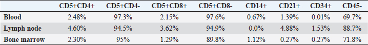 AbstractBackground: Canine T-zone lymphoma (TZL) is recognized as an indolent CD45-T cell lymphoma, with low aggressiveness and high overall survival. The diagnosis is obtained by histopathology and immunohistochemistry, but also by cytological examination of the lymph node associated with immunophenotyping. Lymphocytosis is commonly identified as around 10,000 cells/µl and may reach 30,760 cells/µl. Case Description: The present report describes a case of a female Golden Retriever, nine years old, with generalized lymphadenopathy. In the cytological examination of the superficial cervical lymph node, a monomorphic population of small, “clear cells” and “hand mirror” lymphocyte shape was suggestive of TZL. The leukogram showed intense leukocytosis (160,050 cells/μl) due to small clear cell lymphocytosis (152,048 cells/μl). The myelogram showed a myeloid:erythroid ratio of 2:3; with a pyramidal distribution of cell types and the presence of 22.8% of lymphocytes in the differential count. Bone marrow, peripheral blood, and lymph node immunophenotyping resulted in lymphocyte gates with 97.3% to 99.5% CD5+, predominantly CD4-, CD8-, and CD45- confirming the diagnosis of TZL with associated leukemia. Treatment with chlorambucil and prednisolone was started. During the first month, the lymphocytosis remained above 200,000 cells/uL. After four months of treatment, there was a decrease in lymphocytes, which progressively reached a count of 10,800 cells/ul in the eleventh month. Conclusion: In the literature, lymphocytosis above 30,760 cells/μl has not been observed in TZLs. Thus, it is believed that this is the first report of extreme lymphocytosis with a slow response to chemotherapy. Keywords: Cytology, Flow cytometry, Immunophenotyping, Indolent lymphoma, Lymphocytosis. IntroductionCanine T-zone lymphoma (TZL) comprises 30%–40% of low-grade lymphomas in dogs with an average age onset of 9 years (Seelig et al., 2014). The Golden Retriever stands out with a high prevalence, particularly in certain regions, including Brazil (Jark et al., 2020). TZL exhibits an indolent nature with slow progression and long survival. Typically, it involves one or more lymph nodes, but it has also been reported in other tissues such as the skin and tongue. Peripheral blood involvement may occur with or without lymphocytosis, which is not associated with a worse prognosis. Lymphocytosis is commonly observed at around 10,000 cells/µl and may reach 30,760 cells/µl (Martini et al., 2015). Diagnosis is achieved through histopathology and immunohistochemistry, as well as cytological examination of the lymph node, accompanied by immunophenotyping with loss of CD45 expression. Despite its indolent nature, achieving complete remission can be challenging even with chemotherapy treatment (Mizutani et al., 2016). Case DetailsA nine-year-old female Golden Retriever, weighing 34.2 kg, was attended at the Veterinary Hospital of the Universidade Federal de Minas Gerais (UFMG, Brazil), for investigation of a 3 cm lump in the inguinal mammary gland. On physical examination, there was generalized lymphadenopathy and a body score of 7/9, with remaining physical parameters within normal limits. An abdominal ultrasound was performed, revealing hepatomegaly with the presence of a nodule, iso-to-slightly hypoechoic and homogeneous, measuring approximately 6.22 × 4.26 cm; discrete splenomegaly with heterogenous appearance due to small nodular hypoechoic lesions with diameters varying between 0.32 and 0.62 enlarged medial iliac lymph nodes (left measuring 1.63 × 3.87 cm, right measuring 2.29 × 3.81 cm). Fine needle aspiration of the spleen, liver, superficial cervical lymph node, bone marrow, and peripheral blood were performed. The cytology of the lymph node showed an amorphous basophilic material and a moderate concentration of fat vacuoles and red blood cells (Fig. 1A and B). Nucleated cells were presented in intense concentration, composed of lymphoid cells (97%), macrophages (2%), and neutrophils (1%). Among lymphoid cells, 85% were classified as small, 10% as medium, and 5% as large, with the small cells often having clear, unipolar cytoplasm, typical of “clear cells” and “hand mirror” shapes. The mitotic index was considered low, with only one mitotic figure in five fields at 400× magnification. In conclusion, the cytological examination was suggestive of TZL, and immunophenotyping was recommended for diagnostic confirmation and to rule out possible intense paracortical hyperplasia. In the first blood count, hematocrit was observed at the lower reference limit (37%), platelet counts slightly above the upper reference limit (551,000 cells/μl), and leukocyte counts far above the upper reference limit (160,050 cells/μl), with extreme lymphocytosis (152,048 cells/μl), mild eosinophilia (3,201 cells/μl), monocytopenia (0 cells/μl), and segmented neutrophil count within the normal range (4,801 cells/μl) (Jain, 1993) (Table 2). In the morphological evaluation, the peripheral lymphoid cells were classified as small to intermediate, with a decreased nucleus:cytoplasm ratio compared to typical small lymphocytes, and presenting round to oval nuclei with finely granular chromatin and slightly basophilic cytoplasm, with cell borders showing more intense basophilia, compatible with “clear cells” (Fig. 2A and B). In splenic cytology, a predominance of lymphocytes was observed with a morphological pattern similar to that observed in peripheral blood (Fig. 3A and B). In liver cytology, an intense concentration of hepatocytes was observed, with a slight cytoplasmic rarefaction (Fig. 4A and B), suggestive of hepatic nodular hyperplasia or well-differentiated neoplasia. Bone marrow aspiration was performed in the greater tuberosity of the humerus. The myelogram showed a low concentration of particles with a cellularity (cell:fat ratio) of 60% and a mean concentration of seven to eight megakaryocytes/spicule (Fig. 