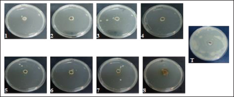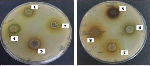 Fig. 1. Zone of growth inhibition after the treatment of E. coli-F17 with different extracts assessed with the inverted Petri dish method. 1: R. raetam; 2: C. cyminum; 3: J. phoenicea; 4: M. oleifera; 5: coffea; 6: U. dioica; 7: L. angustifolia; and 8: C. sinensis. Assessment of biofilm biomass level using crystal violet assayThe biofilm formation of E. coli-F17 in 96-well plates was determined in the presence of different plant extracts. As shown in Figure 4, it is clear that U. dioica and L. angustifolia extract remove the most biofilm biomass. While, when the bacteria is treated with C. cyminum and coffea extract, more than half of the cell clusters remain on the surface. In addition, the biofilm formation was not affected following growth in the presence of M. oleifera, C. sinensis, and J. phoeniea extracts. Integrity of cell membraneLeakage of nucleic acids The amount of nucleic acids (DNA and RNA) released from the E. coli-F17 culture treated with different plant extracts is shown in Figure 5. The UV absorption of E. coli-F17 treated with different extracts quickly increased in about 3 hours, except coffea extract. The O.D260 nm increased rapidly after 6 hours of incubation. The abilities of all eight tested extracts have damaged the E. coli F17’s cell membrane and the nucleic acid to be released. It is obviously seen that the content of DNA and RNA influenced by coffea and U. dioica extracts were higher than others at 6 hours. After 18 hours, OD260 nm values of all samples reached a steady state. Leakage of intracellular proteins The intracellular protein leakage from E. coli-F17 treated with various extracts was shown in Figure 6. In general, a rapid increase of protein concentration occurred in the supernatant of E. coli culture when incubated with different plant extracts. The highest release of intracellular protein by E. coli was obtained after 3 hours of incubation with M. oleifera. Furthermore, the releases of intracellular protein levels reach 4,105 and 4,031 after exposure to C. sinensis and U. dioica, respectively.
