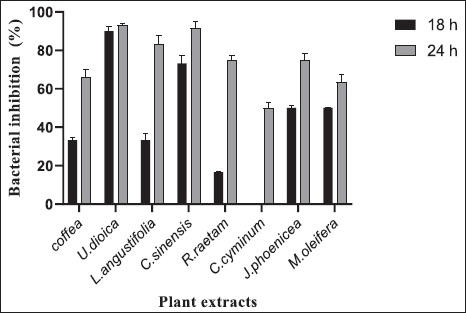 Fig. 2. Antibacterial activity of different plant extracts against E. coli-F17 after 18 and 24 hours. Data are mean ± SD for three measurements.