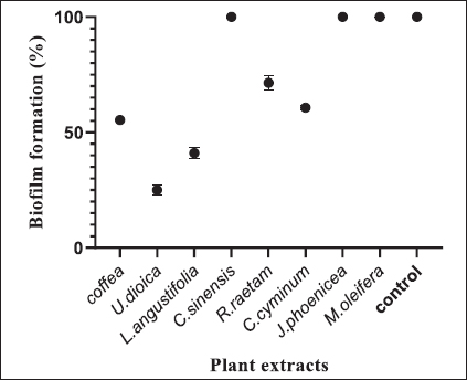 Fig. 4. Effects of plant extracts on the biofilm formation of E. coli-F17. The results are expressed as the mean ± SD of independent experiments.