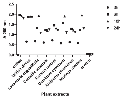 Fig. 5. Release of 260-nm absorbing material (DNA and RNA) from E. coli-F17 treated with plant extracts. Hydrophobicity Bacterial surface hydrophobicity assay was generally used to explain the adhesive ability of bacteria in the gastrointestinal tract. Results of the hydrophobicity of E. coli-F17 strain against hexane are shown in Figure 7. The hydrophobicity percentage of E. coli-F17 decreased to 30%, 34%, and 34.8% after being exposed to C. cyminum, R. raetam, and coffea extract, while the values were 27.2% and 20.3% after treatment with U. dioica and L. angustifolia extract, respectively. On the other hand, when treated with M. oleifera, C. sinensis, and J. phoenicea extracts, the hydrophobic rate was 42%, 45%, and 44.5%, respectively.