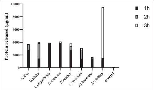 Fig. 6. Leakage of proteins from E. coli-F17 when treated with different plant extracts.