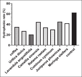 Fig. 7. Hydrophobicity percentage of E. coli-F17 treated with different plant extracts in comparison with control (untreated bacteria). DiscussionMorbidity as well as mortality due to neonatal diarrhea becomes one of the leading causes among camel claves in less than 3 months causing massive havoc in livestock. Among the causative agents of this disease, E. coli was detected at a higher level (Bessalah et al., 2016; Shahein et al., 2021). Adhesion of E. coli to receptors present on the host cell is the first key step in the initiation of infection. Often this goal is achieved by fimbrial adhesins or pili which promote specific receptors binding on the host cell surfaces without the immediate need for cell–cell interaction. Escherichia coli expressing f17 gene, which encodes for F17 fimbriae was highly detected in neonatal camel calves (Bessalah et al., 2016). Several studies have reported that natural products can protect animals against a wide range of pathogens including E. coli (Dubreuil, 2020). Our study investigates the potential antibacterial effects of a panel of natural extracts against E. coli-F17 strain. Bacterial translocation is one of the major factors responsible for colonization and pathogenesis (O’May and Tufenkji, 2011). In the current investigation, we studied the impacts of natural extracts on the motility of E. coli-F17. Swarming motility is mainly involved in bacterial colonization and biofilm development (Costerton and Stewart, 1999; O’May and Tufenkji, 2011). Several researches have proved that different plant materials could decrease the motility of a vast range of pathogenic bacteria (Chow et al., 2011; Inamuco et al., 2012). It has been found that Mallotus japonica extract reduced EHEC swarming motility by disrupting the function of flagella (Lee et al., 2013). Reduced motility was also observed in E. coli when treated with Cranberry extracts (Hidalgo et al., 2011). Our results revealed that the motility of E. coli-F17 was drastically affected in the presence of all extracts. The decrease in swarming motility indicates that plant extracts can effectively alter bacterial adhesion and control biofilm maturation. In fact, swarming motility was found to inhibit the biofilm development of E. coli (Pratt and Kolter, 1998; Beloin et al., 2008; Wood, 2009). Interestingly, recent research has shown that decreased swarming motility was correlated with decreased quorum sensing which is defined as a chemical communication system employed by bacteria to support environmental stress and increase cell-population density (Daniels et al., 2004). The leakage of cell constituents (DNA, RNA, and proteins) was chosen as another aspect to elucidate the mechanism of antibacterial action as it plays an important role in the normal growth of bacteria. Intracellular macromolecular substances release can reflect the morphology of integrity and normal function of the cell membrane of bacteria. An important loss of intracellular contents means that the cytoplasmic membranes were irreversibly damaged which affects bacterial life activities (Wang et al., 2017). This study demonstrated that incubation of E. coli-F17 with selected plant extracts showed strong leakage of DNA and RNA materials after 6h, especially for R. raetam, J. phoenicea, L. angustifolia, and U. dioica extracts. Our result was in agreement with previous studies that reported that for Gram-negative bacteria, the antimicrobial substances can react rapidly with the outer membrane, and intracellular compounds were almost fully released which indicates bacterial death due to depletion of the nutrients (Bajpai et al., 2013). On the other hand, the difference between tested extracts can be explained by the difference in bioactive compound composition between selected plants. In fact, R. raetam contains a high percentage of polyunsaturated fatty acids, and notable contents of vitamin C with superior levels of total phenolic compounds (Saada et al., 2018). On the other hand, J. phoenicea contain several phenolic derivatives such as uslignans, bisflavones, and phenylpropane glycosides (Comte et al., 1997). Thus, we suggest compositional differences might be responsible for the different impacts detected between R. raetam, J. phoenicea, and other extracts on E. coli membrane integrity. Cell surface hydrophobicity is an important physicochemical property involved in bacterial physiology. Hydrophobicity was found to be positively correlated to bacterial adhesion (Saran et al., 2012). Our study revealed that after treatment with different plant materials, cell surface hydrophobicity in E. coli-F17 decreased significantly. The results of this study show that all extracts, exempt U. dioica, can remove up to 50% E. coli biomass biofilm in comparison to the control. The potential of M. oleifera and L. angustifolia extracts in eradicating preformed biofilms has been reviewed in some studies. For example, Zubair (2020) revealed the flesh extract of M. oleifera has antibacterial activity against Staphylococcus aureus and disrupts biofilm development. In another study, Ramić et al. (2021) analyzed the antibacterial and anti-biofilm potentials of L. angustifolia and demonstrated that essential oil was able to eradicate the biofilm formation of Campylobacter jejuni. Our research shows that J. phoenicea and R. raetam extract have some potential for biofilm biomass removal from surfaces since up to 90% of E. coli biofilm biomass could be removed. One reason can be that the R. raetam contains superior levels of bioactive compounds. To the best of our knowledge, this is the first report showing that J. phoenicea and R. raetam reduce E. coli biofilm formation. ConclusionIn conclusion, plant extracts used in this study showed strong suppression of swarming motility, hydrophobicity, and biofilm formation of E. coli-F17 isolated from neonatal camel calves. The present study suggests that these natural extracts have potential uses in colibacillosis mi