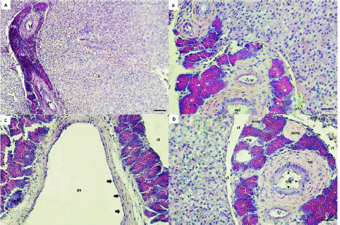 Fig. 3. Hepaticpancreas tissue (hp) architectures are diffused in the liver parenchyma (Li), Hematoxylin–eosin (H&E) staining, exocrine acini (ac) readily recognized around the portal vein (pv), vein (v), artery (ar) and ducts (A, B, C, D). The lobes are surrounded by a thin layer of connective tissue (ct) (B, C, D). The main duct (md) is lined by a simple columnar with a brush border (black arrow heads), surrounded with smooth muscle (sm) and collagen fibers (B, D). The lateral ducts (ld) are lined by simple cuboidal epithelial cells (B). The acini cells are pyramidal in shape with eosinophilic zymogen granules, dark basophilic cytoplasm, and distinct basal nuclei (B). The pv is lined with endothelial cells (black arrow) (C). The melanomacrophage centers (mmc) in Hepaticpancreas are located near the blood vessels and ducts (D). (Bar: A: 0.001 mm; B, C, D: 0.0005 mm). Microscopic structure results showed that hepatopancreatic tissue of G. paganellus was located in the internal surface of the liver and diffused in the liver parenchyma, arranged around the branches of the portal vein, arteries, and ducts in the portal area. Hepatopancreatic tissues were readily discernible (Fig. 3A). The hepatopancreatic tissues represented about 6% of the liver tissue. It has a cluster of an exocrine acinar arrangement, separated from hepatic parenchyma by a thin layer of connective tissues; each acinus consists of mostly organized tall pyramidal cells. The acinus cells have apical eosinophilic zymogen granules, which vary in density, as well as a dark basophilic cytoplasm and distinct basal nuclei that contact the basal membrane (Fig. 3B). Moreover, the pancreatic acinar cells are distinguished from hepatic tissue by their basophilic basal pole and eosinophilic apical cytoplasm and there was no pancreatic endocrine tissue observed among exocrine hepatopancreatic tissue. Thus, the hepatopancreatic portion was clearly shown that it was the exocrine pancreas (Fig. 3B and C). The exocrine hepatopancreas ductular system of G. paganellus is composed of a large main duct and small lateral ducts (Fig. 3A, B, and D). The main duct opens in the middle portion of intestinal lobules (Fig. 3B and C), surrounded by smooth muscle cells, collagenous fibers present between the pancreatic lobules, and lined by the mucosa consisting of simple columnar epithelium with an apical brush border. At the same time, the mucosa of the lateral ducts consists of simple cuboidal cells (Fig. 3B). The melanomacrophage centers (MMCs) of G. paganellus, which are often nodular in appearance, are located near the blood vessels and bile ducts and are lined by a thin connective tissue that enters the organ as septa; some dark pigments have been found in the cytoplasm of these cells, primarily along the edges of the melano-macrophage centers (Fig. 3D). DiscussionThis study describes for the first time the normal anatomy and histology of the liver of G. paganellus. The anatomical description of the liver organ of G. paganellus revealed a pyriform shape, with one lobe that is wide in the anterior portion and narrow in the posterior portion. The liver is a pale yellowish-brown, similar to G. brasiliensis (Bruslé and Anadon, 1996), while the color’s liver and the number of lobes of Hoplias aff. malabaricus and Hypostomus francisci were different (Sales et al., 2017). Maybe the liver color is related to different habits. Whereas the adult individuals of G. paganellus and G. brasiliensis prefer areas with rocks or coral and live on the reef inhabitant of seawater, while H. aff. malabaricus and H.francisci are freshwater fish and pelagic fish (Sales et al., 2017). The liver of G. paganellus has a smooth dorsal surface and a shallow fissure ventral surface surrounded by large blood vessels. While the digestive glands of Neurergus microspilotus and N. kaiseri consist of a big liver and a small pancreas, it is divided into two separated lobes, right and left of both species (Vaissi et al., 2017). However, these results agree with the findings of Vaissi et al. (2017) and Akou (2019) that the gall bladder is situated just dorsal to the right side of the liver lobe of N. microspilotus, N. kaiseri, C. carpiolinnaeus, and Mesopotamichthys sharpeyi. Histologically, this result showed that a thin layer of serous membrane of mesothelium and fibro-connective tissue-rich collagen fibers surround the liver organ of G. paganellus; the covering epithelium may play a role in the protection of the liver fraction during movement by secreting peritoneum fluid in the abdominal cavity. The same appearance was described by El-Shammaa et al. (2008) of gilthead sea bream and Vaissi et al. (2017) of N. microspilotus, and N. kaiseri. In addition, glycogen and fat storage dissolve regularly throughout the histopathologic process, leading to substantial histological variety. The hepatic parenchyma of G. paganellus’ liver consists of hepatocytes spread out as irregular cords arranged radially around a central vein. These cords are not divided into distinct hexagonal lobules, nor do they have portal triads, as in higher vertebrates, agreed with the results shown by Akoul and AL-Jowari (2019) and Akiyoshi and Inoue (2004). Each plate has polygonal-shaped cells with spherical nuclei usually centrally located, eosinophilic cytoplasm with presents a large amount of vacuolated; this arrangement was detected in trout (Anderson and Mitchum, 1974), in tilapia (Abd El-Fatah, 1999), and gilthead sea bream (El-Shammaa et al., 2008). Hepatocytes face the biliary apically and the sinusoidal at the base. Hepatocyte cords can be organized in two cells thick or branch and/or consolidated between two neighboring sinusoids. The hepatocyte arrangement in G. paganellus resembles that recognized in other studies as grey mullets (Biagianti-Risbourg, 1991) and in the Atlantic croaker (Eurell and Hanesly, 1982); the former authors showed that hepatocytes surrounded a sinusoid that was arranged as 