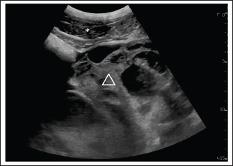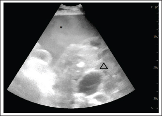 Fig. 1. Ultrasound examination of the abdomen on the first admission. The image was taken at the left inguinal region. Hemoperitoneum was suspected based on a large amount of echogenic and swirling free fluid (*) and was confirmed by abdominocentesis. The honeycomb structure (triangle) was visible in the entire ventral side of the abdomen, pushing against the spleen and stomach on the left side and reaching the kidney and liver on the right side. The honeycomb structure was visible up to the 9th intercostal space.