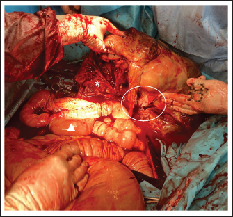 Fig. 4. Intraoperative image of the GCT. Cranial is at the bottom of the image. The ventral midline incision was widened to remove part of the resected GCT and to exteriorize the tumor still attached to the uterine horn. Part of the tumor (*) was resected with a tenotomy knife and the typical honeycomb-like appearance is visible. The right ovarian pedicle (circle) was exteriorized and resected with a sealed device. The bleeding stopped as soon as the ovarian pedicle was sealed. The intestine (triangle) was finally exteriorized after partial removal of the tumor and the abdominal cavity was inspected.