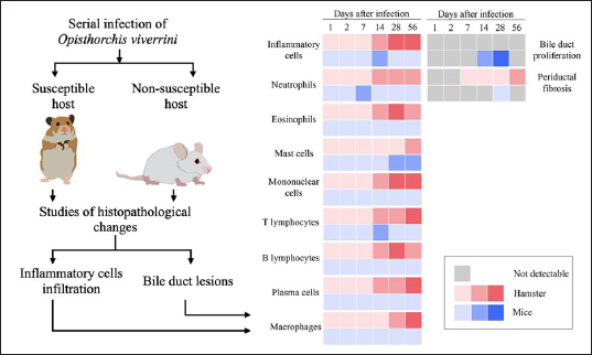 Fig. 1. The heat map illustrates the profile of inflammatory patterns, bile duct proliferation and PDF in susceptible and nonsusceptible animal models of opisthorchiasis. Table 2. Comparison of inflammatory cell infiltration in hepatic parenchyma between mouse and hamster models infected with O. viverrini.