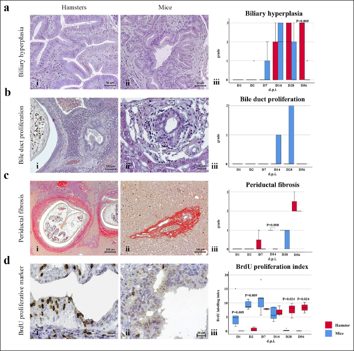 Fig. 3. Comparison of different mononuclear cell types (plasma cells, T lymphocytes, B lymphocytes, and macrophages) that infiltrate the portal area in hamsters and mice infected with O. viverrini. The micrographs represent the different types of inflammatory cells in hamsters (a-di) and mice (a-dii). A comparison of each individual inflammatory cell, including plasma cell (aiii), T-lymphocytes (biii), B-lymphocytes (ciii), and macrophages (diii) are represented by graphs (right column). Mice show the early and minimal response of these mononuclear cell infiltration, while hamsters display a significantly larger and later response (p < 0.05) (a–diii). (ai–aii=H&E; b–di to b–dii,=immunohistochemistry, original magnification, a–di, a–dii=× 40, scale bar depicts 20 μm). Infiltration of plasma cellsThe number of plasma cells, which differentiate from B cells, was rarely detected in mice, whereas the cells gradually increased from D2 to D56 in hamsters (Fig. 3ai and ii). A significant difference in plasma cell numbers between mice and hamsters was found on D14 (p=0.039), D28 (p=0.017), and D56 (p=0.010) (Fig. 3aiii). Infiltration of macrophagesMacrophages are one of the cell types included in the mononuclear cell population. In this study, immunohistochemical techniques were used to demonstrate macrophages in general, without distinguishing between specific types. The results showed that macrophage presence was more prominent in the hamster model (Fig. 3di and ii), especially in the chronic phase on D28 and D56. The hamster model showed significantly higher macrophage infiltration than the mouse model throughout all periods (p < 0.05) (Fig. 3diii). Periductal fibrosisPDF was graded semi-quantitatively according to the criteria described in Table 1. The fibrosis was mainly observed in the first-order bile ducts where O. viverrini was present, but it was rarely seen in the second-order bile ducts. The fibrous tissue presented from periductal tissue of large portal areas which observed on D7 in hamsters and extended to small portal triads in chronic infection on D56 (Fig. 4). Compared to the mouse model, PDF increased significantly in D14 (p=0.008). Correlation between PDF grades and different types of inflammatory cell infiltrationSpearman’s rank-order correlation was used to assess the relationship between PDF and various types of inflammatory cells infiltrating the biliary epithelium (Table 3). Significant correlations were mostly found in the hamster group. In the hamster model, a very strong positive correlation was observed between PDF and eosinophils (rs=0.806, p=0.000), T-lymphocytes (rs=0.838, p=0.000), and plasma cells (rs=0.876, p=0.000), with a strong positive correlation observed with neutrophils (rs=0.633, p=0.002), mast cells (rs=0.667, p=0.001), mononuclear cells (rs=0.631, p=0.002), B-lymphocytes (rs=0.520, p=0.013), and macrophages (rs=0.529, p=0.011). In contrast, the PDF in the mouse model showed a strong negative correlation with neutrophils (rs=−0.470, p=0.009) and a moderate positive correlation with B-lymphocytes (rs=0.383, p=0.037). Proliferative lesionsBiliary epithelial proliferative lesions The present study investigated proliferative lesions of biliary epithelial pathology, focusing on two major microscopic lesions: biliary hyperplasia and dysplasia (as shown in Fig. 4). To determine the cell proliferation activity, we performed BrdU immunohistochemistry and calculated the BrdU index. The index was compared between the models and times to assess the proliferation activity. Biliary hyperplasia and bile duct proliferation Histological evaluation of biliary cell proliferation was performed by grading epithelial hyperplasia in the first-order bile duct and bile duct proliferation in the second-order bile duct. Biliary hyperplasia and bile duct proliferation were categorized based on the proliferation, stratification, and mucosal folding of the biliary epithelium or the number of bile ducts per portal area, and graded as shown in Table 1. Hyperplasia was observed in both rodent models infected with OV (as shown in Fig. 4). In the mouse model, the hyperplasia of the first-order bile duct abruptly increased only on D14, while a similar increase was found in the chronic phase (D28). A higher degree of biliary hyperplasia was observed in the O. viverrini-infected hamster (HOV) group on days 1, 2, 28, and 56, while a higher degree of biliary hyperplasia was observed in the O. viverrini-infected BALB/c mouse (MOV) group on days 2, 7, and 14 (as shown in Fig. 4ai–iii). It was found that marked proliferation was rarely present in both models. BrdU proliferation index Semi-quantitative analysis of biliary cell proliferation by BrdU labeling was performed in immunohistochemically stained portions, where positive biliary nuclei were counted (as shown in Fig. 4) and scored as described in Table 1. In hamsters, a higher degree of BrdU index was found in the OV infection groups on D14, D28, and D56 p.i. In contrast, in mice, the higher BrdU index was found in the early period of OV infection groups, specifically on D1 and D2, which then declined in the late period. The HOV group had a significantly higher BrdU index than the MOV group (p=0.024) on D28 and D56 (p=0.024) p.i. On the other hand, the MOV group showed a significant increase in the BrdU index on the first day postinfection compared to the HOV group (p=0.005). In addition, the MOV group had a significant increase in the BrdU index on D2 p.i. compared to the Hams OV group (p=0.009) (as shown in Fig. 4). Biliary dysplasia Biliary dysplasia recognized by hyperplastic and hyperchromatic epithelium with infrequent mitotic figures was shown in the first-order bile ducts. Dysplasia was commonly seen in areas with active inflammation and its occurrence depended on the duration and study groups. In the mouse model, the lesion was detected earlier and peaked on D14. However, the lesion declined and disappeared at D5