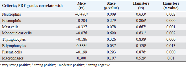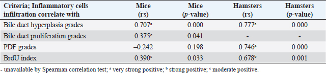 Table 4. Correlation between inflammatory cell infiltration and biliary responses in the hamster and mouse models analyzed by Spearman correlation test.