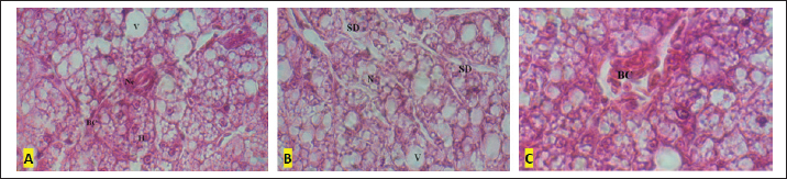 Fig. 3. A–C: Liver tissue of the formaldehyde 37% treated specimens: (V) vacuolation; (BC) blood congestion, (Ne) Necrosis; (H) hepatocyte; SD; (N) Nucleus within hepatocyte (HE × 100).