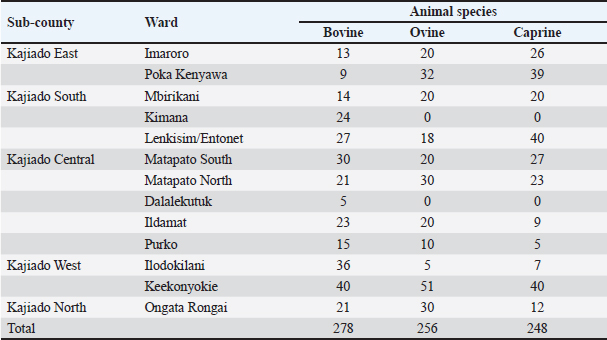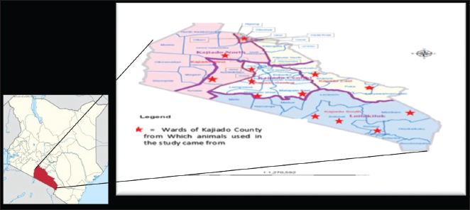 Fig. 1. Map of Kenya showing the location of Kajiado County, and respective wards and study areas (red stars) involved in the study. Sample size calculationThe sample size for animals used in the study was calculated according to the formula for cross-sectional studies by Dohoo et al. (2012). The prevalence rates previously estimated for cattle (21.92%), sheep (14.8%), and goats (11.8%) in Kajiado County (Nakeel et al., 2016) were used to calculate the sample size using the formula: n=Z2p (1-p)/d2, with a margin error (d) of 0.05. Therefore, the calculated sample sizes were: 263 bovine, 186 ovine, and 148 caprine, respectively. Blood sample collectionFive to ten milliliters of blood were collected from respective jugular veins, using a 21G needle, into a vacutainer tube without anticoagulant. The clotted blood was transported chilled on ice to the Faculty of Veterinary Medicine from where serum was harvested from the vacutainer tubes by centrifugation, transferred into sterile 2-ml tubes, and stored at −20°C until use. Serological tests carried-outRBPT was done in the Microbiology Research Laboratory of the Department of Veterinary Pathology, Microbiology, and Parasitology, whereas enzyme-linked immunosorbent assay tests were done in the Immunology Laboratory of the Department of Public Health, Pharmacology, and Toxicology, both of the Faculty of Veterinary Medicine, University of Nairobi, Kenya. All the serum samples [bovine (278); ovine (256); caprine (248)] were tested for anti-Brucella antibodies using the three serological tests. Rose Bengal plate testThe test was carried out following the procedure described in the WOAH (2020) for bovine samples. Briefly, serum samples and antigen were allowed to equilibrate at room temperature for 30 minutes first, and then, 25 μl of each serum sample were mixed with 25 μl of Rose Bengal Brucella antigen (from CITA, Spain) on a clean white porcelain plate. The mixture was then gently shaken using two hands for up to 4 minutes at ambient temperature. In a positive reaction, there was evidence of agglutination. Any amount of agglutination was scored positive regardless of the degree. All plates showing no evidence of agglutination were scored negative. Every plate test included a positive and negative serum sample as controls. For ovine and caprine samples, a modified RBPT method (Blasco et al., 1994) was used. In this method, 75 µl of serum and 25 µl of antigen were used as described above for bovine sera. Indirect enzyme-linked immunosorbent assayThe bovine brucellosis i-ELISA kit according to the manufacturer's instruction (Elabscience Biotechnology Inc, 8th edition), 2018. The test results were determined by measuring the absorbance or optical density (OD) using a Microplate reader at 450 nm wavelength. The interpretation of the results was based on the following ODs: OD reading Result ≥0.38 Positive ≤0.38 Negative The sample results were calculated as percentage positive, relative to the strong positive control serum (S/P) using the formula: S/P%=100 × [(Sample OD—negative control OD)/(Mean OD of positive control—negative control)]. A sample was considered positive if the S/P value was greater than 120%. Competitive enzyme-linked immunosorbent assayThe c-ELISA kit used in the study was the COMPELISA 160 & 140 kit from APHA Scientific (www.aphascientific.com). The test was conducted according to the instructions of the manufacturer. The microtiter plates were read in a Microtiter plate reader with the 450 nm filter. The results of the tested samples/wells were interpreted by comparing readings of the test samples to those of both positive and negative control wells. A plate was considered valid if the mean OD of the 6 negative controls at 450 nm was greater than 0.700, and the mean OD of the 6 positive controls was less than 0.100 [www.aphascientific.com]. The difference between the OD of the positive and negative controls had to be equal to or greater than 0.300. A cut-off was determined using the conjugate control, i.e., 60% of the mean OD of the four conjugate control wells (Praud et al., 2012). Any OD equal to or below the determined cut-off value was considered as being positive, while values above the cut-off were considered negative [www.aphascientific.com]. Statistical analysisData obtained from the serological tests were entered into a spreadsheet (Microsoft Excel 2010 version, Redmond, WA), and the proportions were estimated for the individual, herd, Ward, and sub-county brucellosis seroprevalence. The individual animal seroprevalence was calculated by dividing the number of RBPT- and/or c-ELISA-positive animals by the total number of animals that were tested. The herd-level seroprevalence was calculated by dividing the number of herds with at least one reactor on the RBPT and c-ELISA by the number of all the herds tested. Associations between hypothesized risk factors and the outcome variables were assessed, and statistical analysis was performed using chi-square tests and logistic regression using the statistical software STATA® version 16 (Stata Corp LLC, College Station, TX), and Epitools applications (Sim and Wright, 2005) Ethical approvalAnimal handling and sample collection were done in conformity with the principles of good clinical practice and the study was approved by the Ethical and Biosafety Committee of the Faculty of Veterinary Medicine (Ref: FVM BAUEC/2019/236) of the University of Nairobi, Kenya, as well as National Commission for Science, Technology and Innovations (NACOSTI) license No: NACOSTI/P19/951. ResultsAnimals sampled in the studyIn total, 278 bovine, 256 ovine, and 248 caprines were sampled in the study (Table 1). Animal-level brucellosis prevalence in Kajiado CountyThe results of serological testing for anti-Brucella antibodies in bovine, ovine, and caprine are given in Figure 2. At the animal level, 54/782 animals tested were positive, thus giving a county-level animal seroprevalence of 6.9