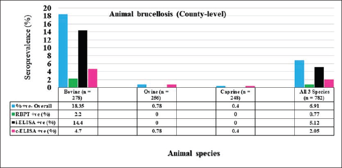 AbstractBackground: Brucellosis is a serious zoonotic infection with a global socioeconomic impact on both the livestock industry and human health. In Kenya, brucellosis is endemic but there is limited information on the true burden of the disease due to weak or peace-meal surveillance. The true burden and spread of animal brucellosis in Kajiado County is not known. Aim: The aim of the study was to determine the current seroprevalence and spatial distribution of livestock brucellosis in Kajiado County and also to compare the three serological tests, namely; Rose Bengal plate test (RBPT), indirect enzyme-linked immunosorbent assay (i-ELISA), and competitive ELISA (c-ELISA) in the detection of seropositive animals. Methods: A cross-sectional study was undertaken in 5 sub-counties and 13 wards, where a total of 782 serum samples from unvaccinated bovine (n=278; 34 herds), ovine (n=256; 25 flocks), and caprine (n=248; 28 flocks), were screened for anti-Brucella antibodies using RBPT, i-ELISA, and c-ELISA tests, in parallel. Results: Overall animal seroprevalence was 6.91% (54/782); while that for bovine, ovine, and caprine was 18.35% (51/278), 0.78% (2/256), and 0.4% (1/248), respectively. Bovine seroprevalence was 2.2% (6/278), 14.4% (40/278), and 4.7% (13/278) in RBPT, i-ELISA, and c-ELISA tests, respectively; while ovine 0.78% (2/256) and caprine 0.4% (1/248) were positive only in c-ELISA. Bovine herd seropositivity was 67.65% (23/34), whereas ovine and caprine flock seropositivities were 8% (2/25) and 3.6% (1/28), respectively. Conclusion: The findings indicate a moderate seroprevalence of brucellosis in bovine, while that of ovine and caprine was low in Kajiado County. Indirect ELISA was found superior to both c-ELISA and RBPT in detecting bovine seropositive animals, while c-ELISA was superior to both RBPT and i-ELISA in detecting seropositive ovines and caprines. These results will contribute to baseline data for further study of Brucella infection and a starting point for the formulation of a strategy for the control of brucellosis in Kajiado County. Keywords: Brucellosis, Livestock, Seroprevalence, Kajiado County. IntroductionBrucellosis is a serious disease of both economic and public health importance as it affects the health and productivity of different animals including cattle, sheep, goats, pigs camels, and also humans. It is endemic in many developing countries in Africa, including Kenya (Djangwani et al., 2021). The disease is caused by small Gram-negative, nonmotile coccobacilli belonging to the genus Brucella, which comprises 12 recognized species, all of which show varied host specificity (Godfroid et al., 2010; Khurana et al., 2021). Brucella species responsible for animal brucellosis include Brucella abortus (mainly affecting cattle), Brucella melitensis, mainly affecting goats, Brucella suis, mainly affecting pigs, and Brucella ovis, occasionally affecting sheep (Godfroid et al., 2010; Khurana et al, 2021). Human brucellosis is mainly due to Brucella melitensis, B. abortus, and B. suis. In female animals, brucellosis is characterized by late abortions in gravid animals, the birth of weak offspring, lowered fertility, retention of fetal membranes, endometritis, and reduction in milk production, while in male animals, it causes orchitis and epididymitis. Hygromas may be seen in chronic infections in both sexes (Godfroid et al., 2010; Khurana et al., 2021). Most human cases are directly or indirectly linked to animals or their products such as raw milk and milk products prepared from such milk (Godfroid et al., 2010). A proper diagnosis of brucellosis in both humans and animals is a key requirement for the control and elimination of the disease (Khan and Zahoor, 2018). Both direct and indirect approaches are used for the diagnosis of brucellosis in animals. Direct methods include the isolation and identification of Brucella organism, which is the “gold standard,” or detection of its nucleic acid from tissues or organs of infected animals using polymerase chain reaction (PCR)-based methods (Ducrotoy et al., 2018). Indirect methods involve the detection of antibodies produced by the host immune response against the bacterial immunodominant smooth lipopolysaccharide during infection (Corbel, 2006). Serological tests are crucial for laboratory diagnosis of brucellosis since most control and eradication programs rely on these methods (Senbeto, 2022). Different serological tests have been used globally to screen for and confirm brucellosis in both humans and animals (Ducrotoy et al., 2018; WOAH, 2020; Rossetti et al., 2022; Mengele et al., 2023). The most commonly used screening tests in animals include the Rose Bengal plate test (RBPT) or indirect enzyme-linked immunosorbent assay (i-ELISA), with CFT or competitive ELISA (c-ELISA) as confirmatory tests, and these are also recommended tests for trade by World Organization of Animal Health (WOAH, 2020). Various researches indicate a clear difference in the number of seropositive animals detected using different serological tests (Chota et al., 2016; Djangwani et al., 2021; Mengele et al., 2023). Most serological tests used for the diagnosis of brucellosis are, however, riddled with what is referred to as diagnostic conundrums (Moreno et al., 2022). These include technical issues surrounding their performance and interpretation, as well as being subject to complex biological, and epidemiological factors, such as differences in the quality of test reagents, the reproductive or immunological status of the animals, latent infections, and cross-reactivity with other Gram-negative bacteria (Díaz-Aparicio et al., 1994; Nielsen et al., 2004; Munoz et al., 2005; Praud et al., 2012; Moreno et al., 2022). To establish the true brucellosis status of a herd, it is recommended that at least more than one test be used, with one serving as a screening test and the other one, as a confirmatory test (Ducrotoy et al., 2018). In many countries