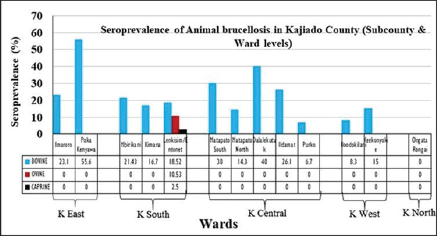 Fig. 4. Sub-county and ward seroprevalence of livestock brucellosis in Kajiado County. There was moderate agreement between RBPT and c-ELISA and between i-ELISA and c-ELISA ( k=0.4034; 95%CI: 0.1218–0.6851) with an overall proportion agreement of 96.04%. In contrast, there was a slight agreement between RBPT and the i-ELISA test ( k=0.1417; 95%CI: 0.0042–0.2792), with an overall proportion agreement of 86.33% (Table 2). Sub-county and ward-level seroprevalence of livestock brucellosis in Kajiado CountyThe seroprevalence and spread of livestock brucellosis were also compared across all 5 sub-counties and 13 wards of Kajiado County; the results are shown in Figure 4. Sub-county seroprevalences of animal brucellosis ranged from 4.76%–36.4%, 0%–5.13%, and 0%–2.6%, for bovine, ovine, and caprine, respectively. All the five sub-counties involved in the study had bovine herds with at least one seropositive animal. Kajiado East sub-county had the highest seroprevalence followed by Kajiado Central and Kajiado South. Kajiado West sub-county had moderate seroprevalence, whereas, Kajiado North had the lowest seroprevalence of bovine brucellosis in Kajiado County. There was no significant difference in seroprevalence of bovine brucellosis between the sub-counties of Kajiado County (p > 0.05), except between Kajiado East and Kajiado North, and between Kajiado East and Kajiado West (p < 0.05). For ovine and caprine flocks, the seropositive animal(s) were all from the sub-county of Kajiado South. Sub-county seroprevalence rates for ovine and caprine brucellosis ranged from 0%–5.13% and 0%–2.6%, respectively. Twelve out of 13 (92.3%) wards involved in this study had herds with at least one seropositive animal for bovine brucellosis. Ward seroprevalence rates for bovine brucellosis ranged from 0%–55.6%. High seroprevalence rates (≥30%) were in Poka Kenyawa, Dalalekutuk, and Matapato South wards, respectively; moderate seroprevalence rates (14%–29%) were in Ildamat, Mbirikani, Imaroro, Lenkisim/Entonet, Kimana, Keekonyokie, and Matapato North wards; whereas, low seroprevalence rates (≤10%) were in Purko, and Iloodokilani wards, respectively. Ongata Rongai ward had no herds with seropositive animals. There was no significant difference in the seroprevalence of bovine brucellosis between wards in the same sub-county (p > 0.05). For small ruminants, only 1/13 (9.1%) wards had at least one ovine and caprine flock with seropositive animal, respectively. All the seropositive ovine and caprine flocks were from the Lenkisim/Entonet ward. The remaining 10/11 (90.9%) wards had no seropositive animals. Ward seroprevalence rates for ovine and caprine brucellosis ranged from 0–10.53 and 0–2.5, respectively.