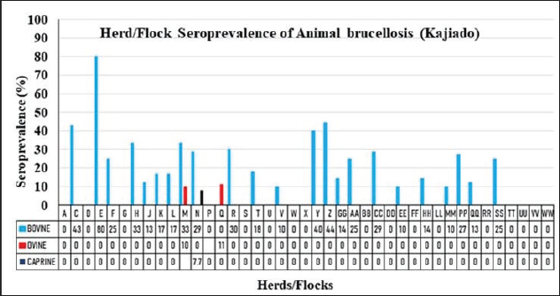 Fig. 5. Herd/flock seroprevalence of livestock brucellosis in Kajiado County. Herd and flock seroprevalence of animal brucellosis in Kajiado CountyThe results of the seroprevalence of bovine brucellosis are shown in Figure 5. Overall, 23/34 (67.65%) bovine herds had at least one seropositive animal; 11/34 (34.35%) herds had no seropositive animals. Herd seroprevalence for bovine brucellosis ranged from 0%–80%. In general, there was no significant difference in seroprevalence rates between herds in the same ward (p > 0.05). Only 2/25 ovine (8%) and 1/28 caprine (3.6%) flocks had at least one seropositive animal. Ovine and caprine animal-level seroprevalence rates within flocks ranged from 0%–11.1% and 0%–7.7%, respectively. There was no significant difference between ovine and caprine flock seroprevalence of brucellosis (p > 0.05). Animal brucellosis versus history of abortionIn the study, 11/34 (32.35%) bovine herds had a history of abortion, and of these, 9/11 (81.8%) had at least one seropositive animal (Fig. 6). On the other hand, 23/34 (67.65%) herds had no history of abortion, and of these, 14/23 (67.65%) had at least one seropositive animal. There was no significant difference in brucellosis seroprevalence between herds with abortion history and those without (p > 0.05). At the animal level, 27/98 (27.6%) of animals in herds with abortion history were seropositive, whereas 24/180 (13.3%) animals were seropositive in herds without abortion history. Overall, animal-level seroprevalence rates in bovine herds with abortion history were significantly higher than those without abortion history (p < 0.05). Only one seropositive ovine and caprine flock, respectively, had a history of abortion. The other seropositive ovine flock had no history of abortion. Spatial distribution of bovine brucellosis in Kajiado CountyThe spatial distribution of bovine brucellosis in Kajiado County is shown in Figures 7 and 8. The highest seroprevalence rate (≥30%) of bovine brucellosis was in the Kajiado East sub-county, with a moderate rate (11%–24%) in Kajiado Central, Kajiado South, and Kajiado West (Fig. 7). Kajiado North sub-county had no seropositive herds. There was a moderate seroprevalence rate (11%) of ovine, and a low seroprevalence rate (2.3%) of caprine brucellosis in Narok South sub-county, specifically in the Entonet/Lenkisim ward; other sub-counties had no detectable burdens of small ruminant brucellosis (Fig. 8). DiscussionThe objective of this study was to determine the current seroprevalence and spatial distribution of animal brucellosis in Kajiado County as well as compare the three serological tests, namely; RBPT, i-ELISA, and c-ELISA in the detection of seropositive animals. The results of the study show that there was a moderate seroprevalence in bovine (18.35%), and a low seroprevalence in ovine (0.78%) and caprine (0.4%) brucellosis in Kajiado County. The present study is the first one to carry out an extensive serological survey of livestock brucellosis in Kajiado County of Kenya. Simultaneous use of three serological tests in parallel rather than in series provided a more complete assessment of the immune response of animals to Brucella infection and also deepened the understanding of infection-immune response dynamics at the animal level.