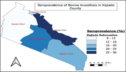 Fig. 7. Sub-county distribution of bovine brucellosis in sub-counties of Kajiado County. The animal-level seroprevalence (6.91%; n=782) found in this study is significantly lower than that previously reported for the same area (21.91%; n=209) (Nakeel et al., 2016) (p < 0.05). It is also lower than for Narok County and Baringo Counties (Enström et al., 2017; Nthiwa et al., 2019; Lokamar et al., 2022). It is, however, comparable to that reported for Marsabit County, (Osoro et al., 2015). The animal-level seroprevalence was also within the range of 0.2–43.8 reported for the East African region (Djangwani et al., 2021; Warioba et al., 2023). The similarity in animal-level seroprevalence results between countries within the East African region could be attributed to similarities in traditional grazing practices as most regions from which studies have been conducted happen to be in pastoral areas, where different animal species are mixed, and grazing pastures and watering points are shared. Globally, the prevalence detected in this study was lower than for Nigeria, Ethiopia, and Angola, respectively (Mufinda et al., 2015; Ogugua et al., 2018; Akinyemi et al., 2021; Tschopp et al., 2021). The variations in results observed in different studies may probably be attributed to several factors such as the epidemiological situation, sampling techniques, sample sizes, different diagnostic tests used, and interpretations of results. Bovine seroprevalence (18.35%) found in this study is comparable to that previously reported in one study in the same county (Nakeel et al., 2016), and also Baringo County (Lokamar et al., 2022). It was significantly higher (p < 0.05) than for Marsabit and Kiambu counties, respectively (Osoro et al., 2015) (p < 0.05), but was lower than for the Maasai Mara area in Narok County (Nthiwa et al., 2019). Bovine seroprevalence in this study was also significantly higher (p < 0.05) than the range (0%–13%) reported for the East African region and Nigeria (Akinyemi et al., 2021; Djangwani et al., 2021). It was, however, much lower than for South Sudan (Madut et al., 2018).