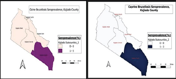 Fig. 8. Distribution of ovine and caprine brucellosis in sub-counties of Kajiado County. In this study, 23/34 (67.6%) bovine herds had at least one seropositive animal for brucellosis, indicating that in Kajiado County, two out of every three bovine herds are seropositive for brucellosis. The herd seroprevalence observed in this study is significantly higher than the 28% previously reported for the same county (Osoro et al., 2015). The difference between the herd seroprevalence in the current study and that by Osoro et al. (2015) could be attributed to several factors such as the extent of the geographic area covered, sampling techniques, sample sizes, different diagnostic tests used, and interpretations of results. The herd seroprevalence in the current study is, however, comparable to that reported for Marsabit County, Tanzania, and Sokoto State in Nigeria (Osoro et al., 2015; Cadmus et al., 2021; Warioba et al., 2023). It was, however, higher than that reported for Kiambu County in Kenya, and also other countries including, Uganda, Angola, and Cameroon (Mufinda et al., 2015; Mugizi et al., 2015; Osoro et al., 2015; Awah-Ndukum et al., 2018). The relatively high levels of individual and herd seroprevalence recorded in this study are indications of a high level of introduction of infected animals to herds through transhumance, and a high level of mixing of herds in communal grazing pastures, as well as livestock markets. Variation in management and hygiene practices in the farms has been associated with differences in seroprevalence rates reported in various studies (Mufinda et al., 2015; Ndazigaruye et al., 2018; Mfune et al., 2021). However, the differences in herd seroprevalence rates reported in Kajiado County of Kenya in this study, and other regions of Africa and beyond could also be attributed to the protocol adopted such as the different diagnostic tests used, and their sensitivities and interpretations. The protocol could have involved one test or more than one test carried out in series, which entails the use of a screening test followed by confirmation of positive reactors by another test, or in parallel, whereby all tests are used to test the sampled animals independently (Awah-Ndukun et al., 2018; Ducrotoy et al., 2018; Moreno et al., 2022). The differences could also be attributed to other factors including the differences in management practices in the areas studied, sampling techniques and sample sizes, and seasonal cattle movements in search of pastures during drought periods (Akinyemi et al., 2021; Mfune et al., 2021; Warioba et al., 2023). One of the clinical manifestations of animal brucellosis is abortion (Merga Sima et al., 2021; Rehman et al., 2020). In the current study, 11/34 (32.4%) bovine herds had a history of abortion, whereas 23/34 (67.6%) had no history of abortion; 9/11 (81.8%) of the herds with abortion history had at least one seropositive animal, whereas 14/23 (60.9%) without abortion history were seropositive. At the animal level, seroprevalence of bovine herds with a history of abortion had significantly higher prevalence rates of brucellosis than those without (p < 0.05). In addition, bovine herds with a history of abortion had an odds ratio of 3.54 (95% CI:0.631–19.819), implying that the chances of getting one brucellosis seropositive animal were 3.5 times more in herds with a history of abortion than those without. Other studies have also reported high brucellosis prevalence rates in herds with a history of abortion (Ndazigaruye et al., 2018; Rehman et al., 2020; Merga Sima et al., 2021). Generally, seroprevalence of small ruminant brucellosis in Kenya has fluctuated between 0% and 20% for ovine and 0%–13.8% for caprine (Djangwani et al., 2021). This study found very low levels of ovine (0.78%; n=2/256) and caprine (0.4%; n=1/248) brucellosis than seroprevalence levels reported in previous studies in Kenya, including Baringo, Tana River, Kiambu, and Marsabit counties (Djangwani et al., 2021; Mwasi, 2021; Lokamar et al., 2022). The seroprevalence rates in this study were even lower than those reported in a previous study in the same county (Nakeel et al., 2016). Ovine and caprine seroprevalences were however, within the range (0%–20%) reported for the East African region (Chota et al., 2016; Djangwani et al., 2021; Akwongo and Kakooza, 2022). Other researchers have reported variable animal seroprevalences according to regions and locations (Mugizi et al., 2015; Ndazigaruye et al., 2018; Edao et al., 2020). In this study, there was no significant difference in the seroprevalences of ovine and caprine brucellosis (p > 0.05), which may suggest common epidemiological cum management factors and aetiological agents in seropositive flocks. Taken together, these findings indicate a low prevalence of brucellosis in small ruminants in Kajiado County, Kenya. The flock seroprevalence rates for ovine (8%; n=2/25) and caprine (3.6%; n=1/25), were higher than 0.34% and 1.78% for ovine and caprine, recently reported in the same county (Mwasi, 2021). These results are in agreement with those reported in one study in the same area in which only two ovine and one caprine flock, from Entonet/Lenkisim Ward, in South Kajiado sub-county had at least one seropositive animal (Mwasi, 2021). These results suggest the possibility of there being similar management practices for small ruminants in the Kajiado South sub-county. In other studies, differences in management practices have been reported to be responsible for the observed differences in the seroprevalence rates in different locations or regions of the same country (Asiimwe et al., 2015; Tegegn et al., 2016). In this study, all ovines from Kajiado East were seronegative, which is in stark contrast with the findings of another study in which the Mashuru area in Kajiado East sub-county had the highest seroprevalence of ovine brucellosis (Nakeel et al., 2016). These differences could be explained by factors such a