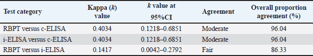 Fig. 3. Seropositivity of bovine serum samples in the three serological tests in Kajiado County. Thirty-five out of 278 (12.6%) bovines were seropositive in i-ELISA but negative in both RBPT and c-ELISA. On the other hand, 9/278 (3.24%) bovines were positive in c-ELISA but negative in RBPT and i-ELISA; and 2/278 (0.72%) bovines were positive in RBPT but negative in both i-ELISA and c-ELISA tests. There was no difference in bovine seropositivity in both RBPT and i-ELISA, RBPT and c-ELISA, i-ELISA and c-ELISA, and in all three serological tests (p > 0.05) (Fig. 3). Table 2. Agreement between the 3 serological tests.